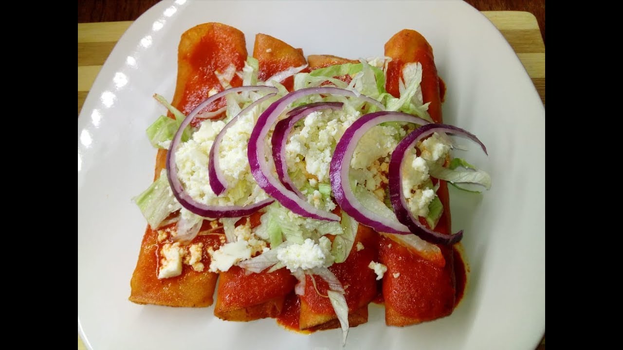 Deliciosas enchiladas fritas en adobo, rellenas de pollo. Van acompañadas con su lechuga picada, queso y crema. Salsa de jitomate y chile serrano, bolillo y frijoles incluido en las enchiladas.