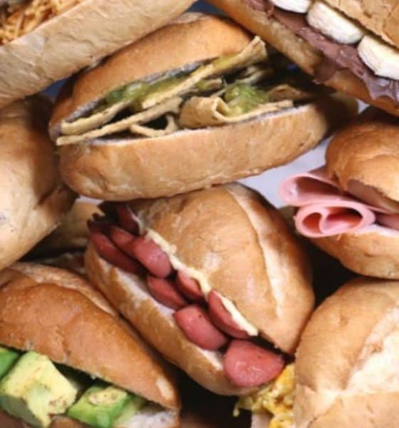 Lonche en birote con chilaquiles rojos. Lleva crema, queso, cebolla y salsa picante.
