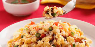 Huevo revuelto guisado con cebolla, jitomate y chile verde picado. Va acompañado de frijoles y bolillo.
