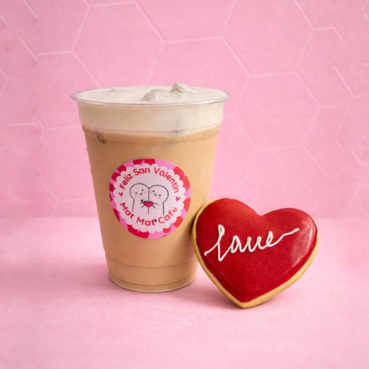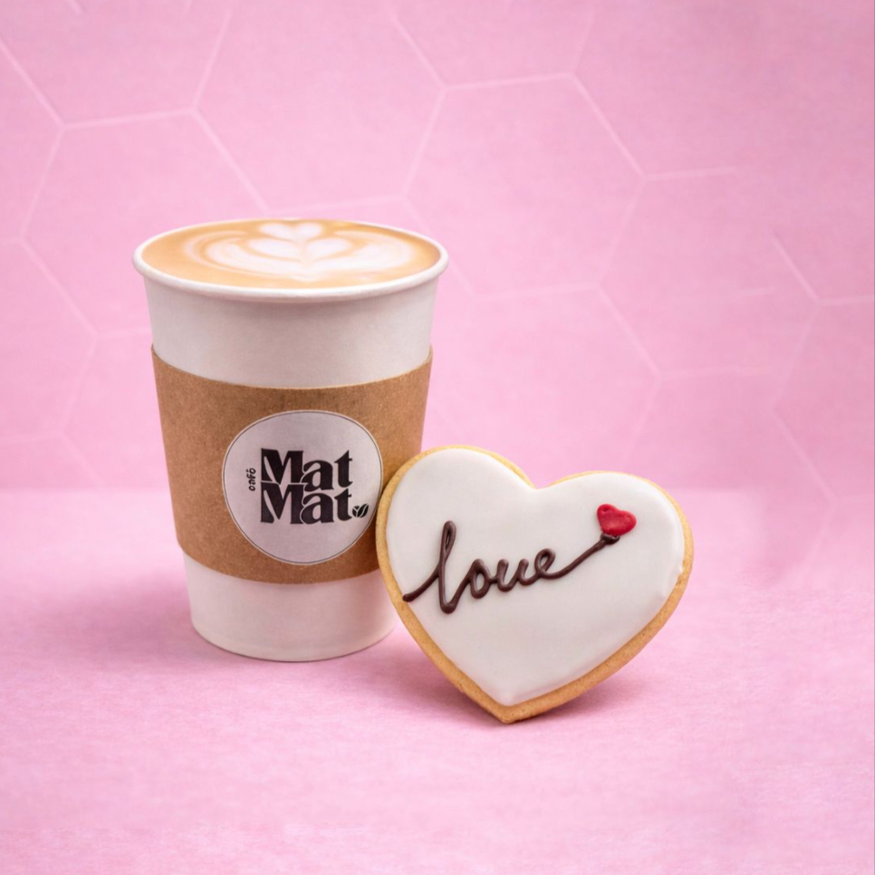 Un latte caliente acompañado de nuestra galleta corazón. La pausa perfecta para consentirte.