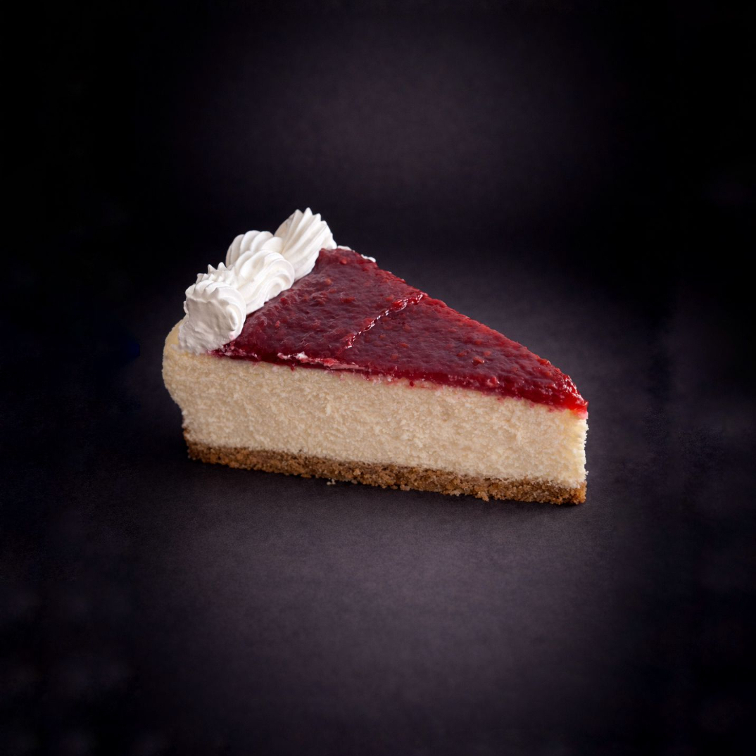 Rebanada de cheescake de queso crema con base crujiente cubierta de frutos rojos.