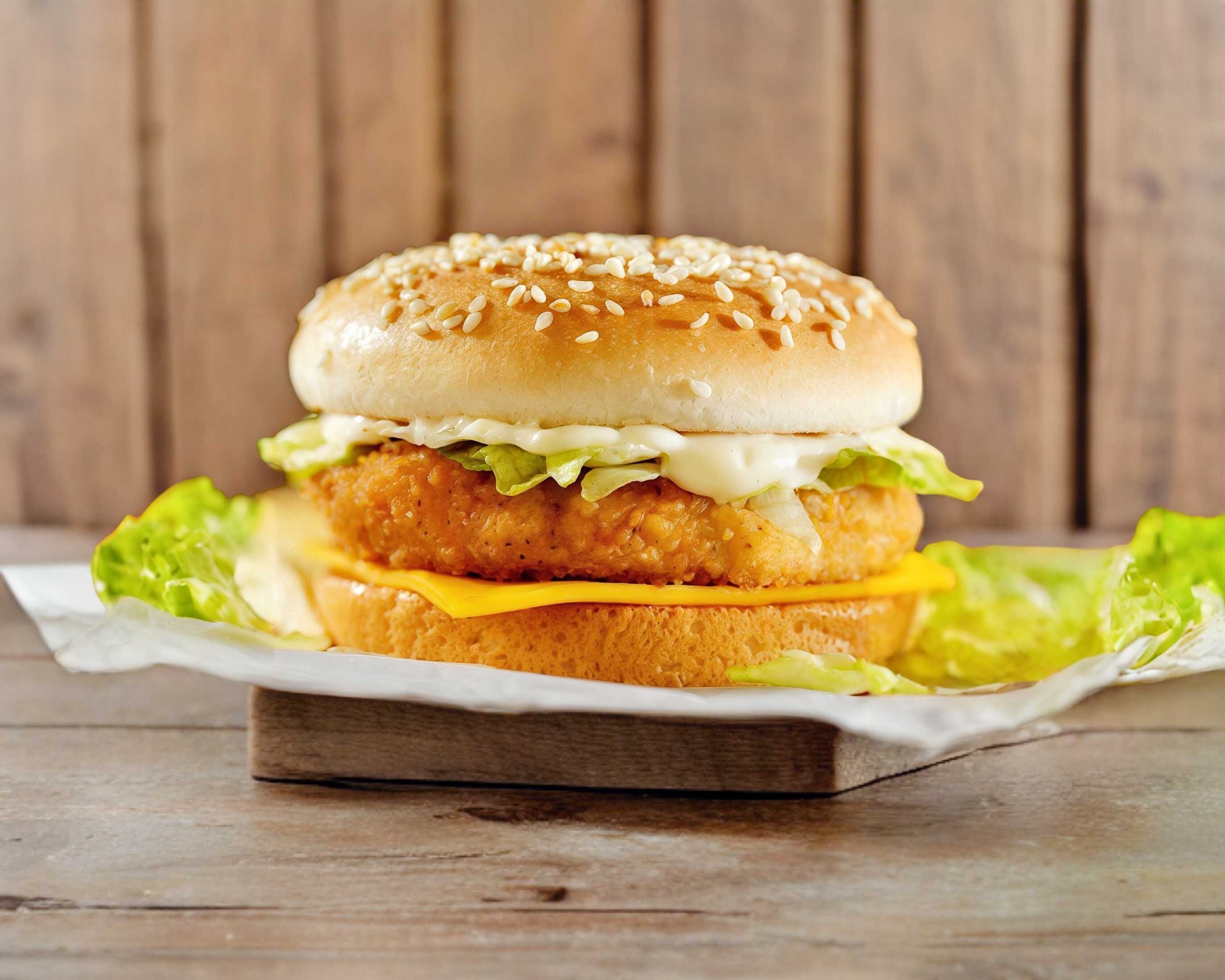 Hamburguesa de pollo (pollo rebozado en tempura peso 100g) rebozada en tempura, con queso blanco gouda, lechuga, jitomate, cebolla y aderezo de la caza en un pan brioche artesanal sin ajonjoli