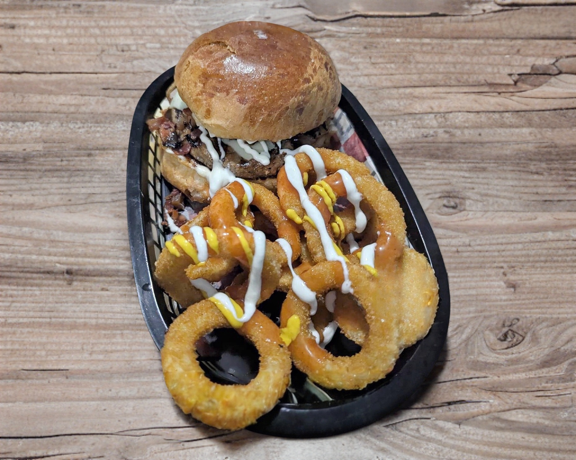 Deliciosa carne sirloin de 150g con trocitos de tocino crujiente y cebolla caramelizada en una cama de queso amarillo con pan brioche artesanal.