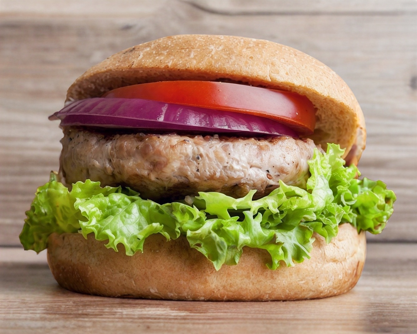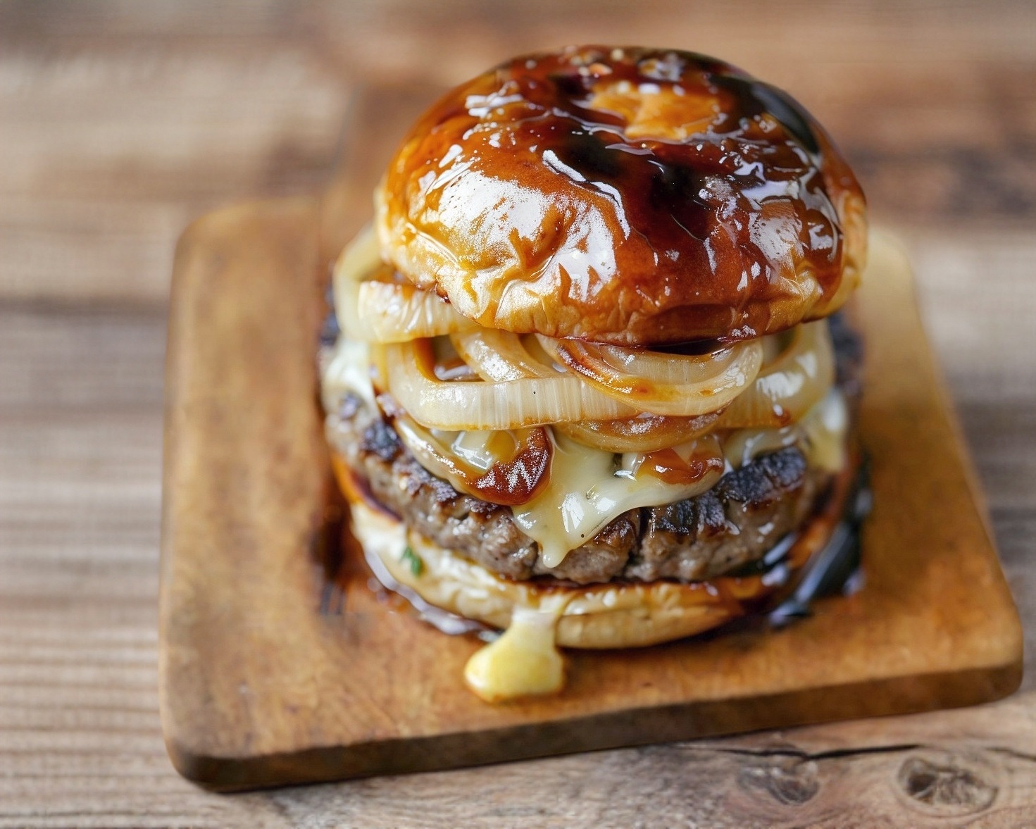 Deliciosa carne sirloin de 150g con mostaza dulce, cebolla crispy y trocitos de tocino, sobre una rebanada de queso blanco en un pan artesanal.