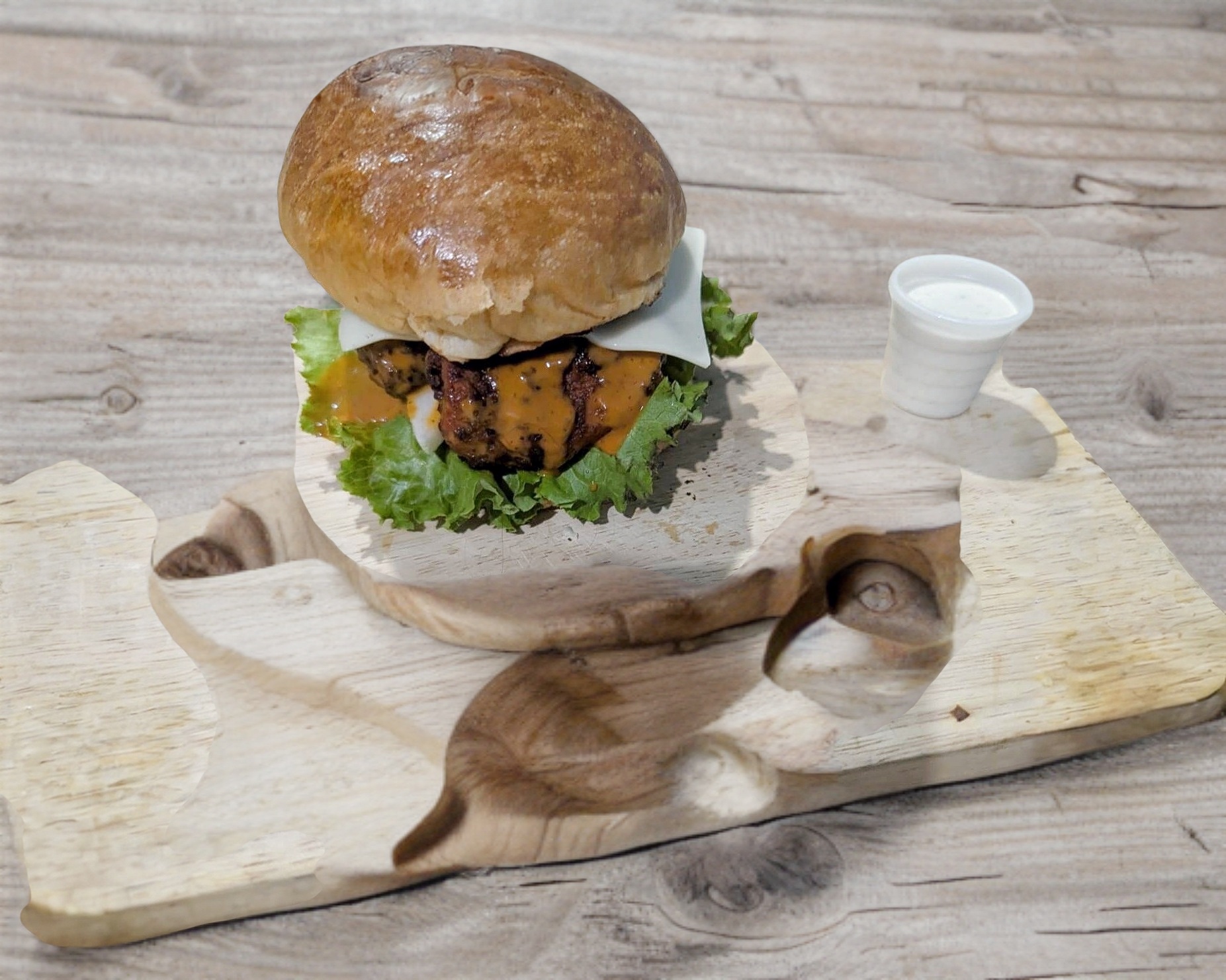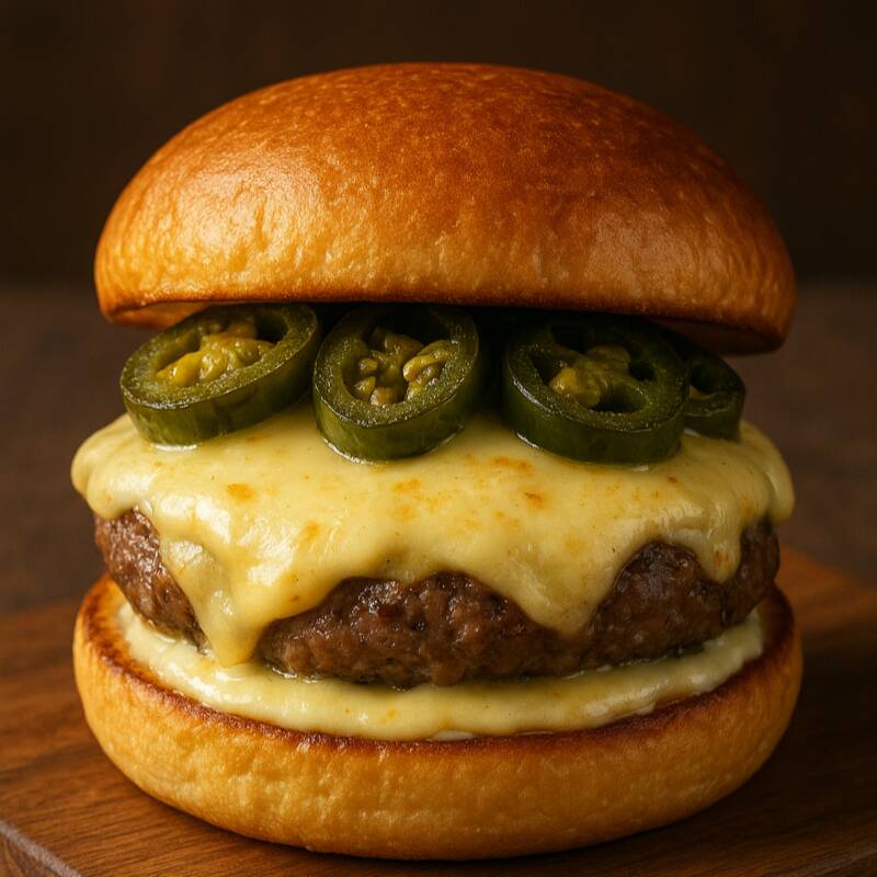 Jugosa carne de sirloin de 150 g acompañada de una irresistible mezcla de cuatro quesos gratinados elaborados con leche entera de vaca. Coronada con jalapeños toreados y servida en un suave pan brioche artesanal, ligeramente untado con mayonesa para equilibrar cada sabor.