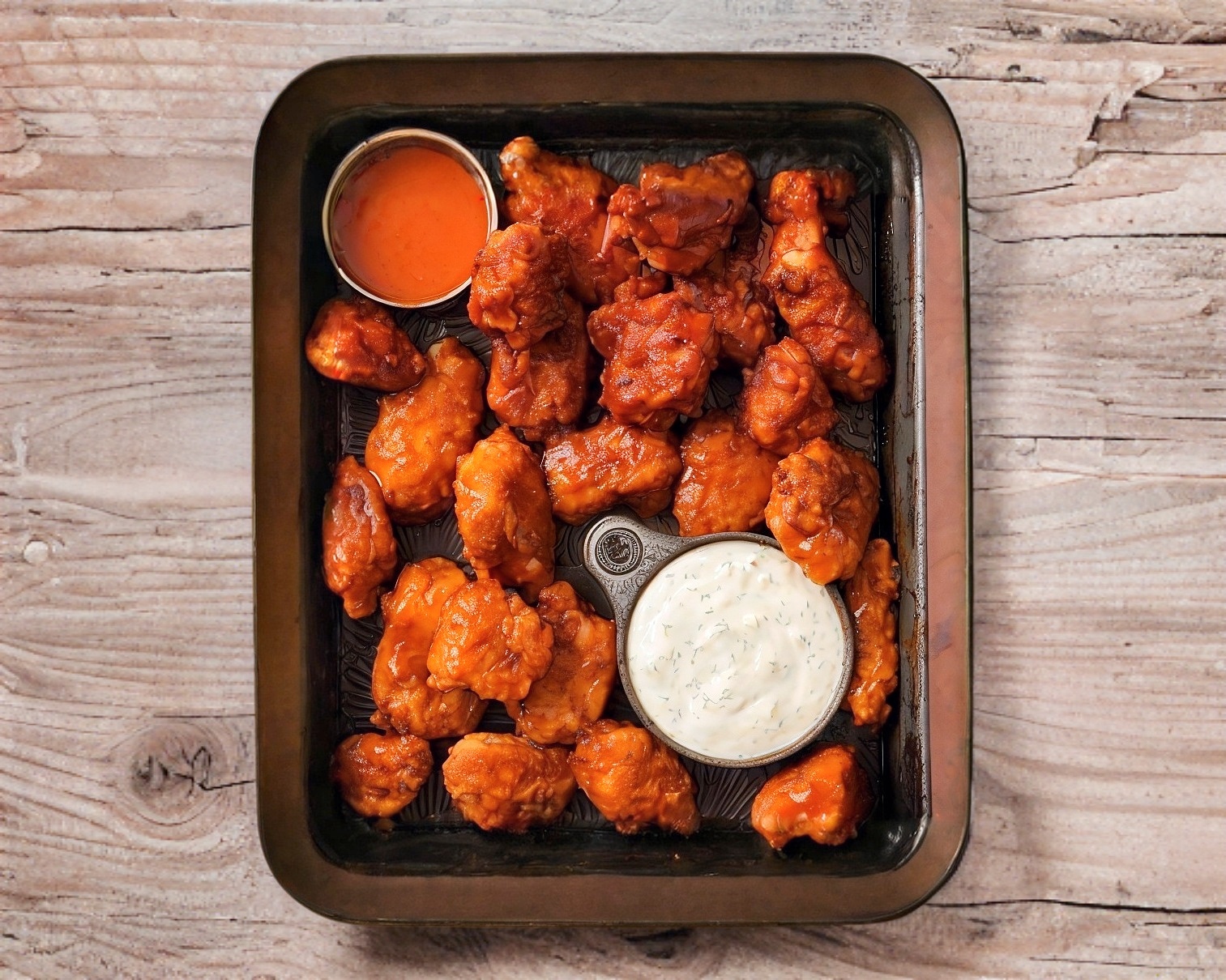 Boneless de pechuga de pollo (300 gr) mas salsa a tu elección. Incluye un aderezo Ranch