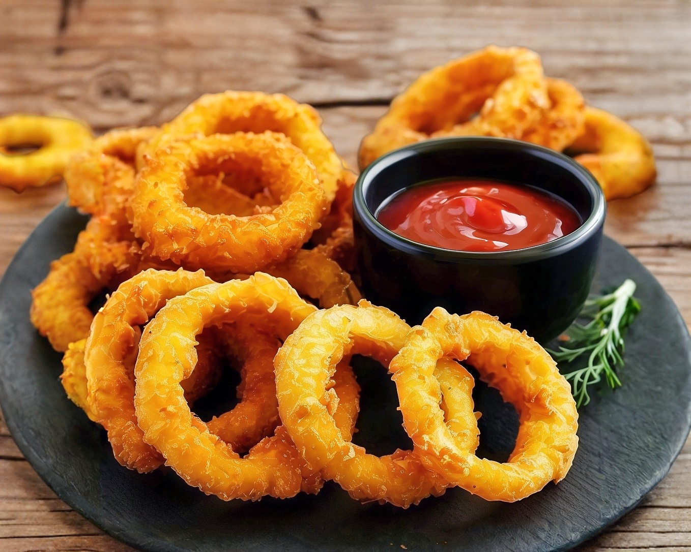 Deliciosos aros de cebolla sazonados 6 piezas con aderezo rach para acompañar
