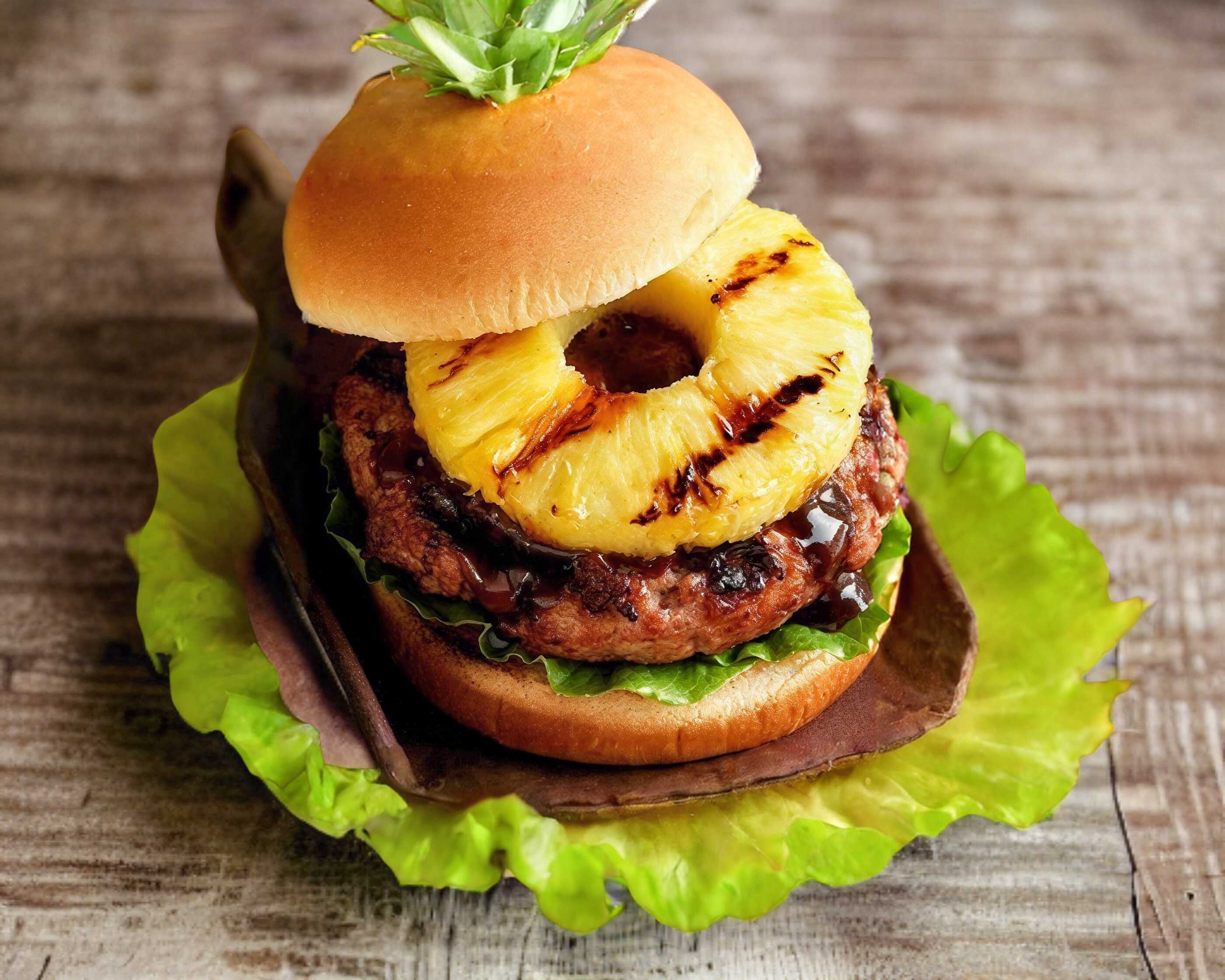 Deliciosa hamburguesa con 150 gr de carne sirloin, con jamon, piña asada lechuga y cebolla en una cama de queso blanco gouda en un pan brioche artesanal.