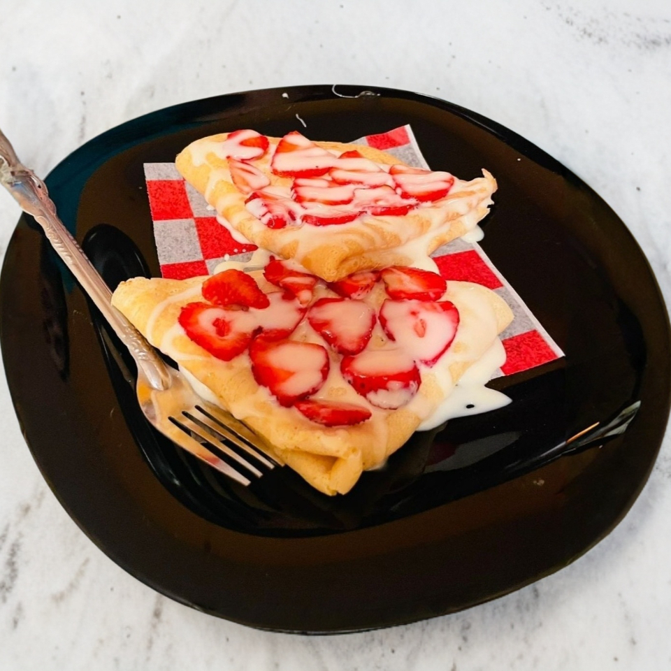 Platillo personal, crepa sencilla ( dos crepas de 25 cm y porciones acordé al tamaño ) Elige una base y un topping.