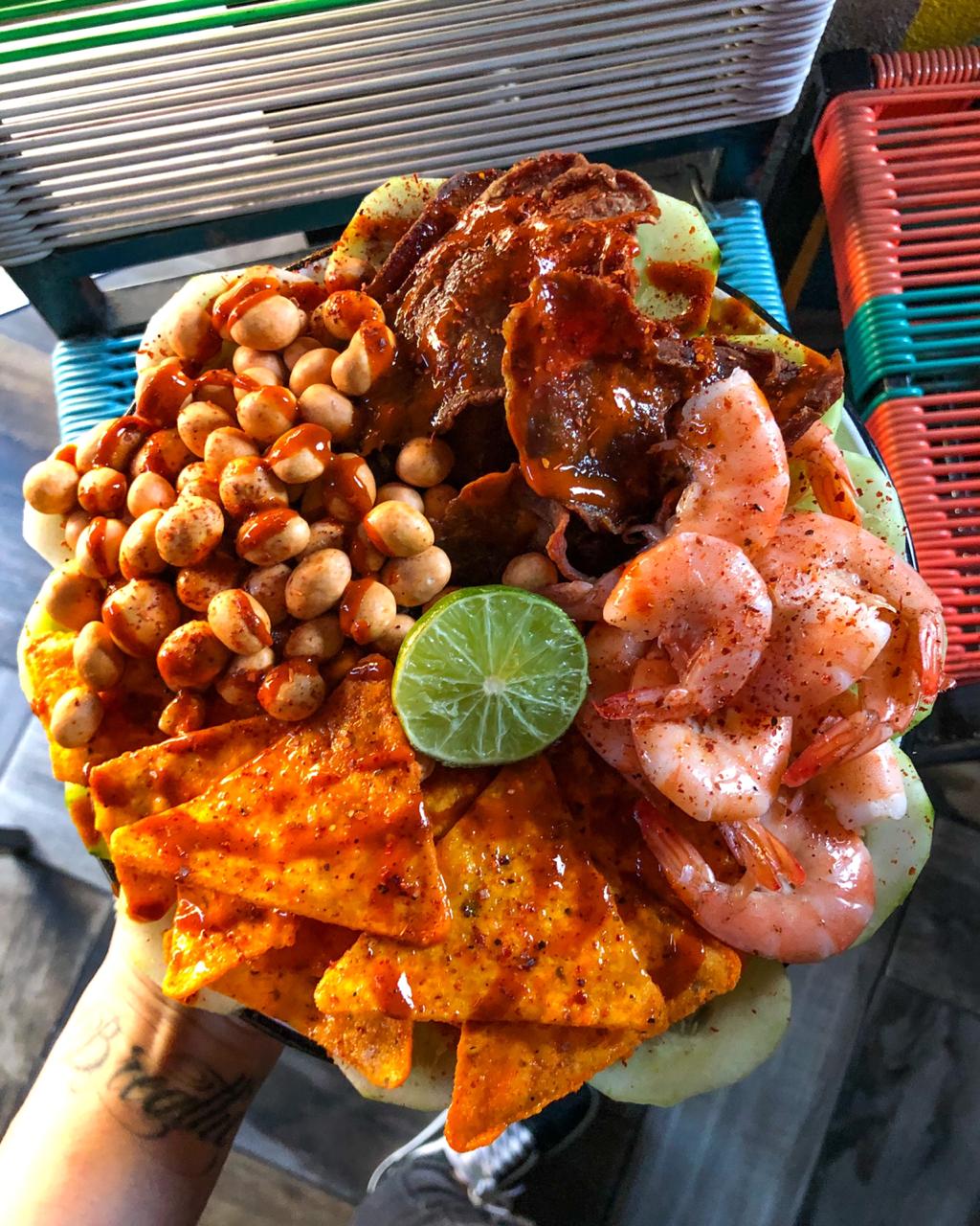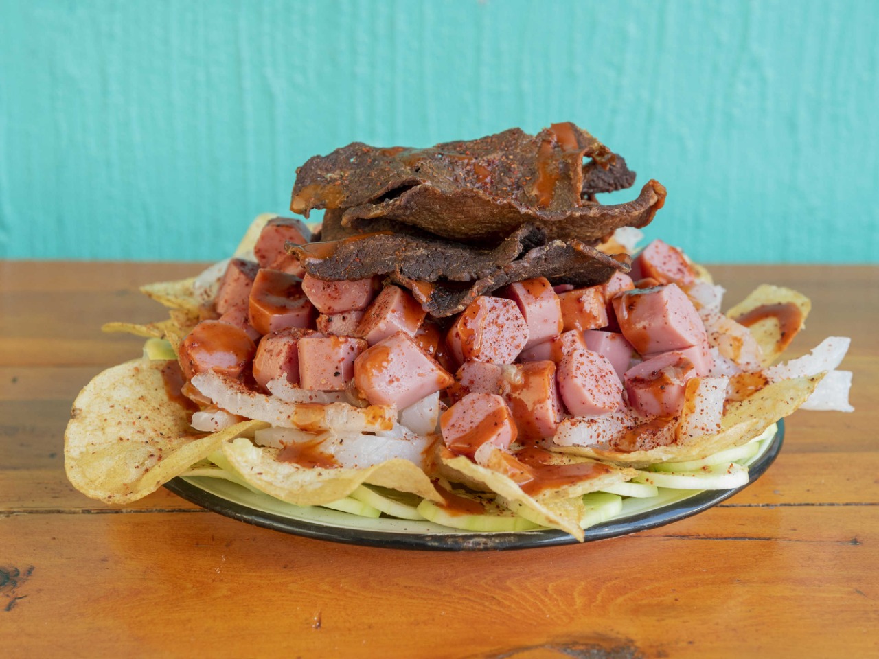 Botana de Doritos, pepinos, salchicha y cueritos.