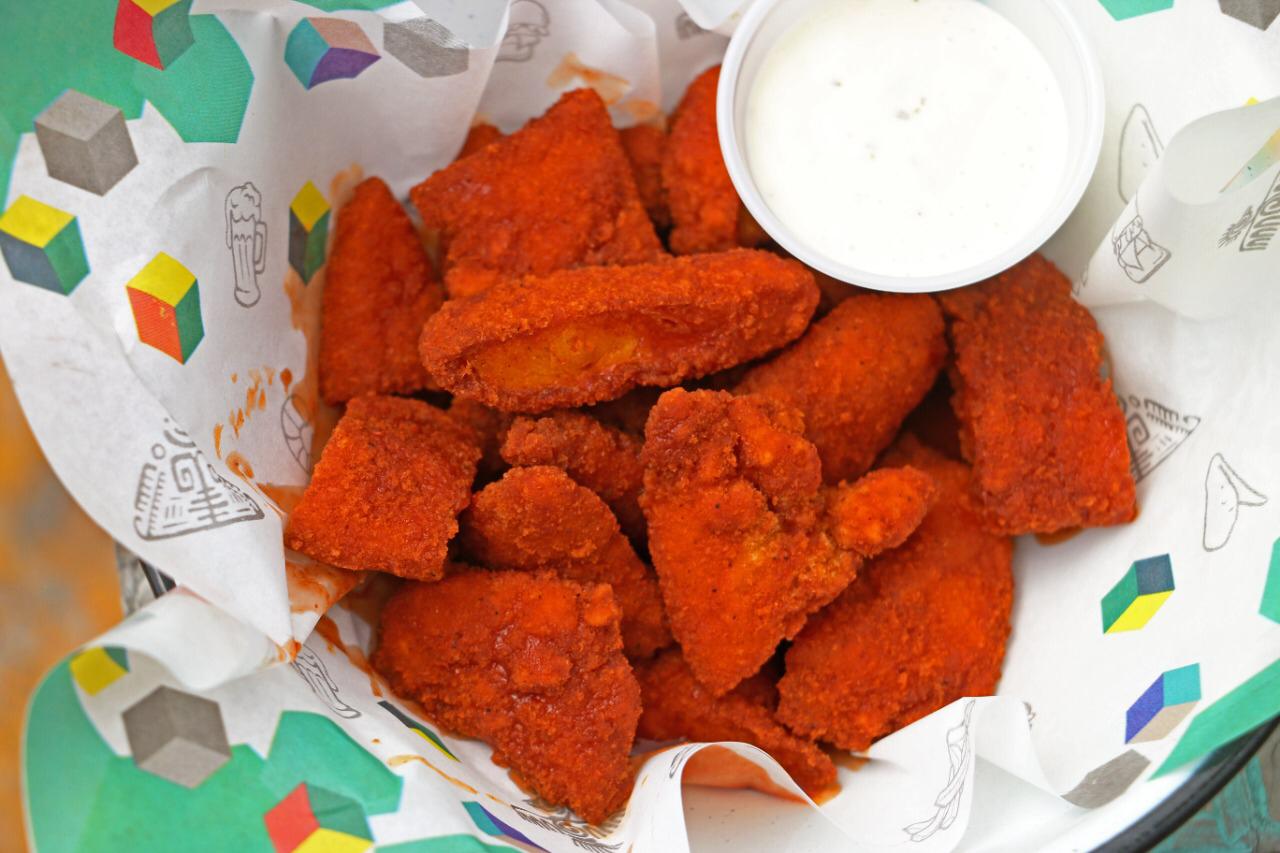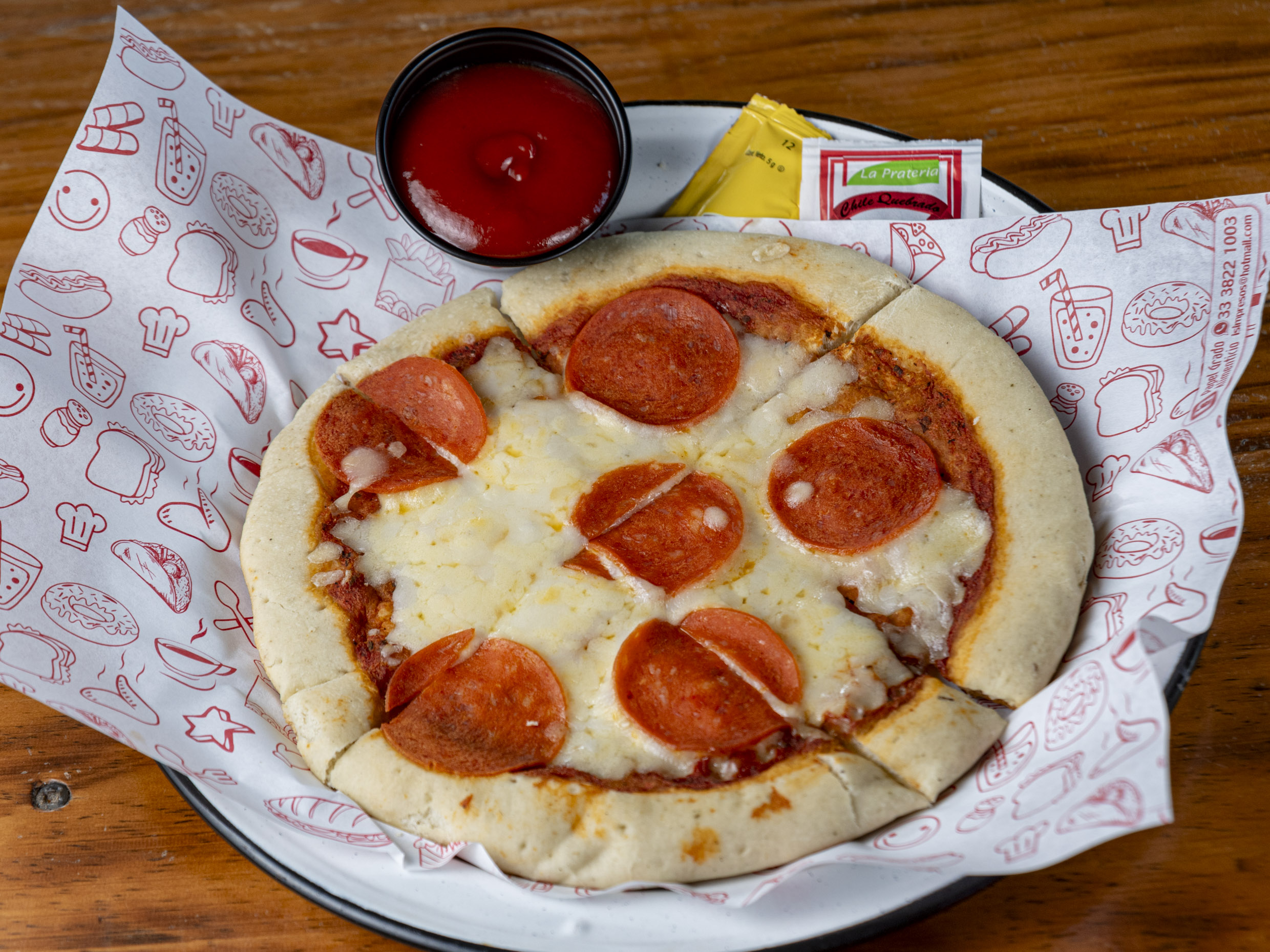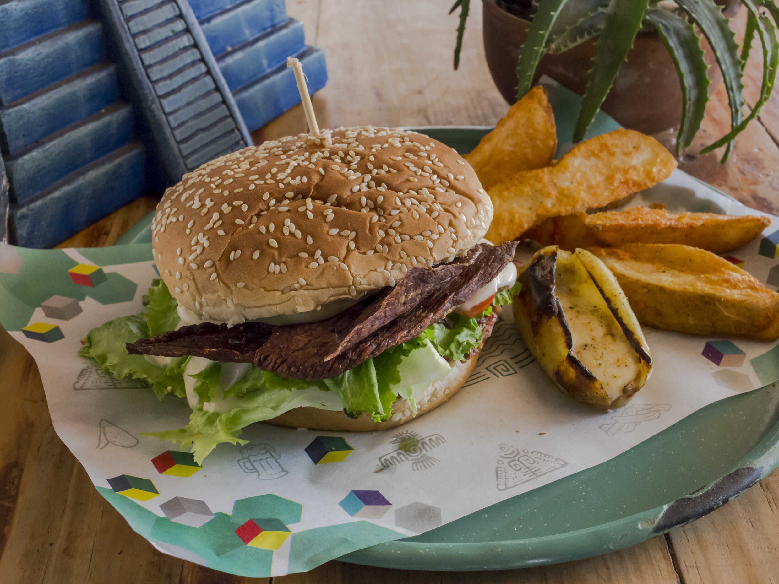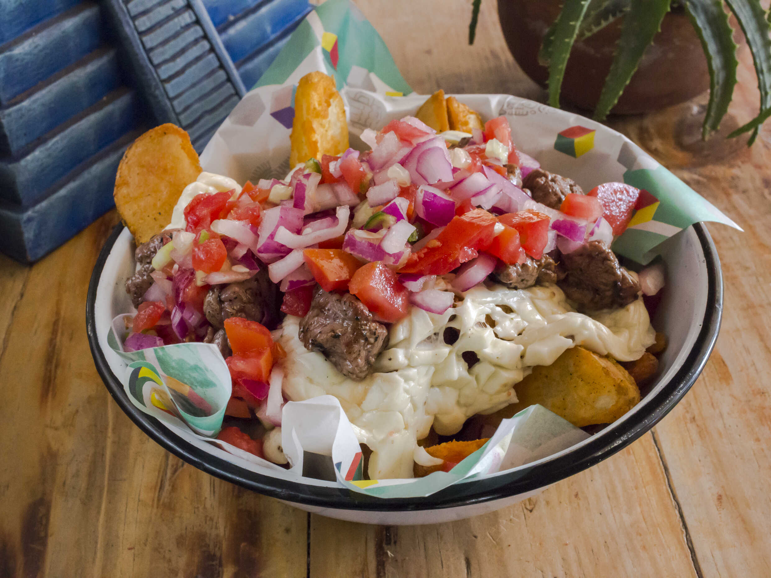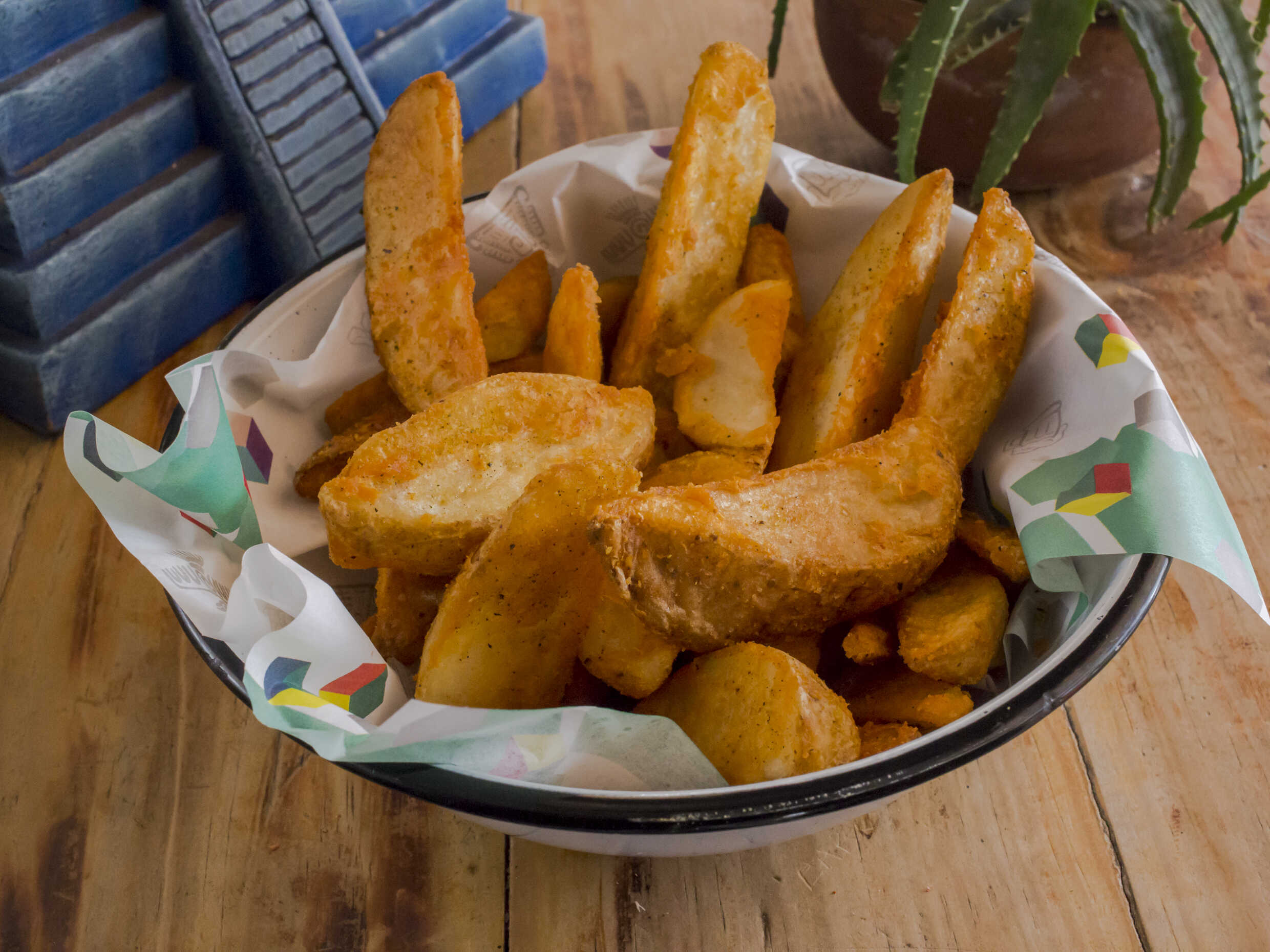 Botana de papa dorada con salchicha, cuero y pepinos.
