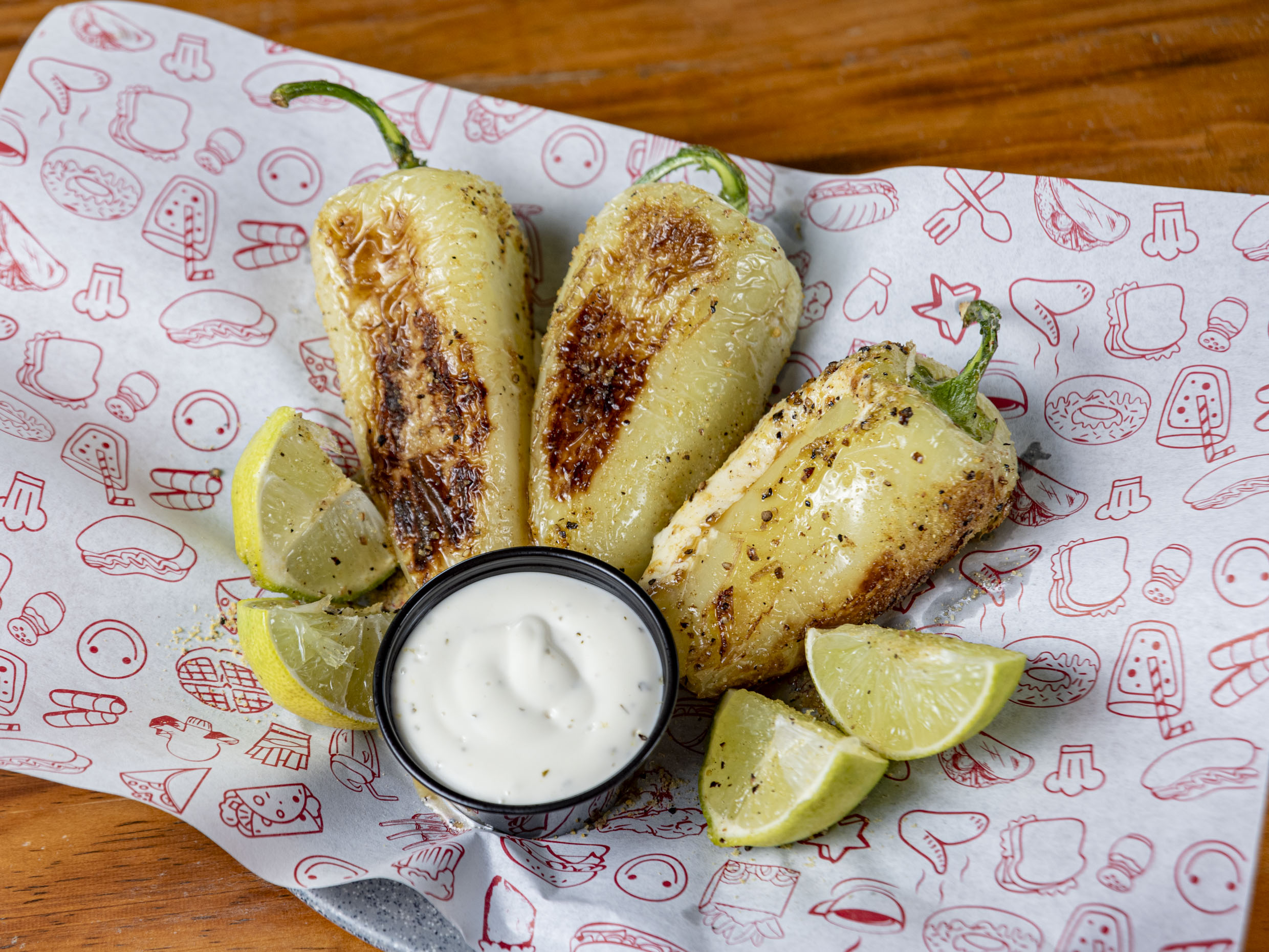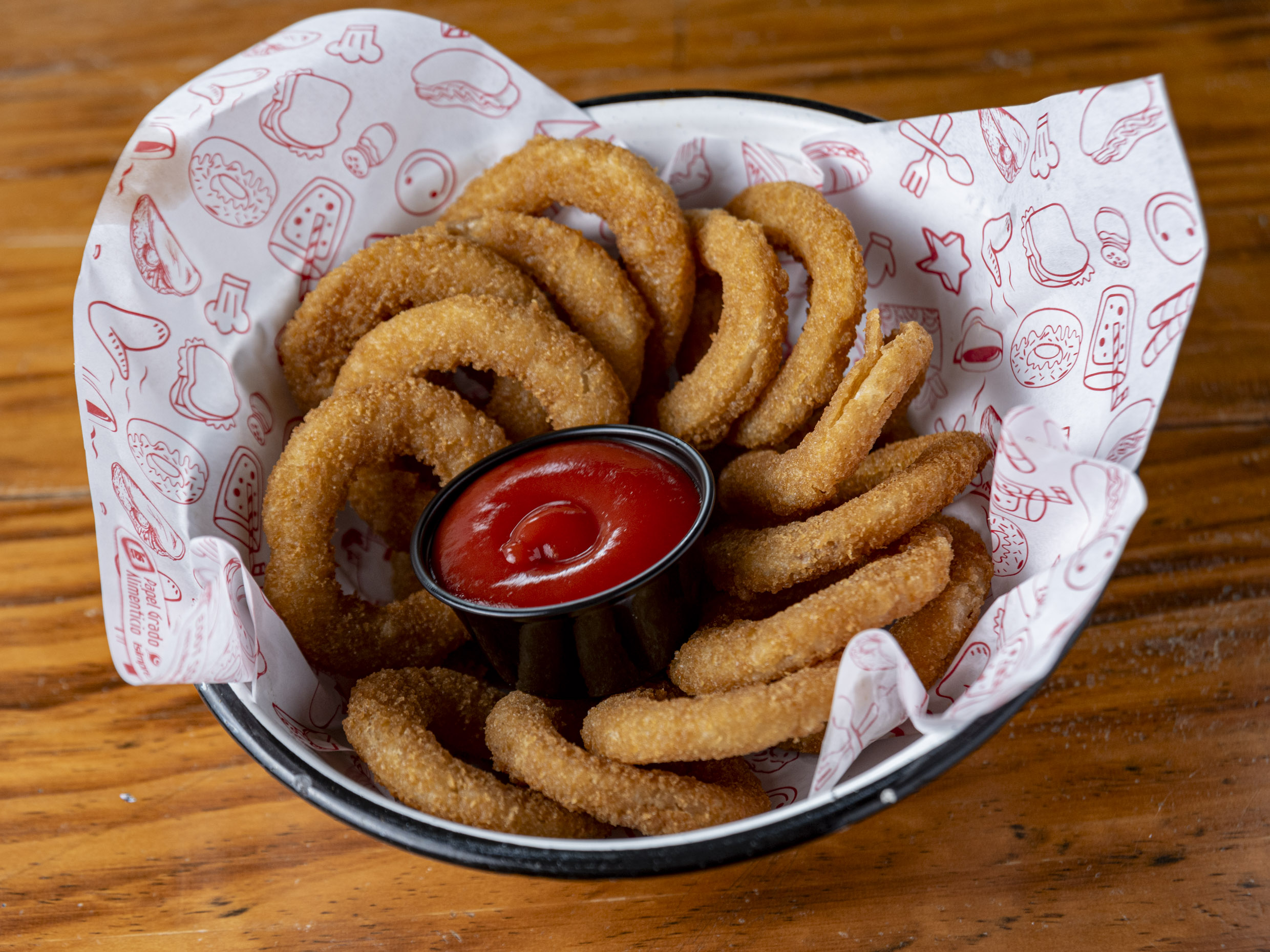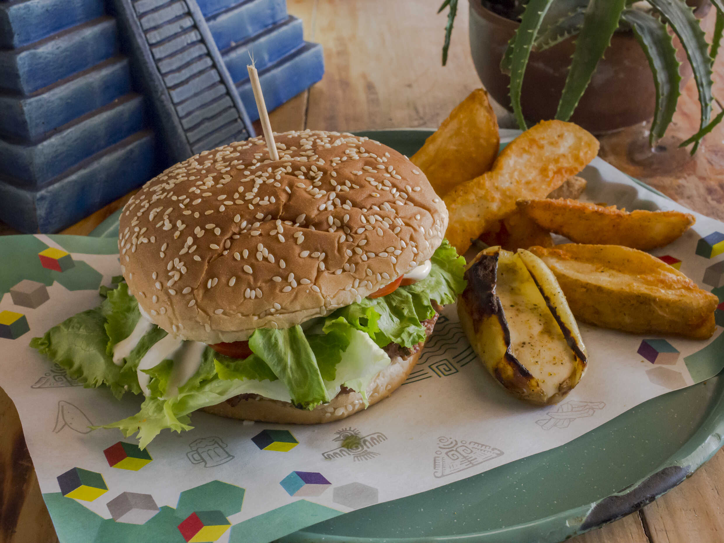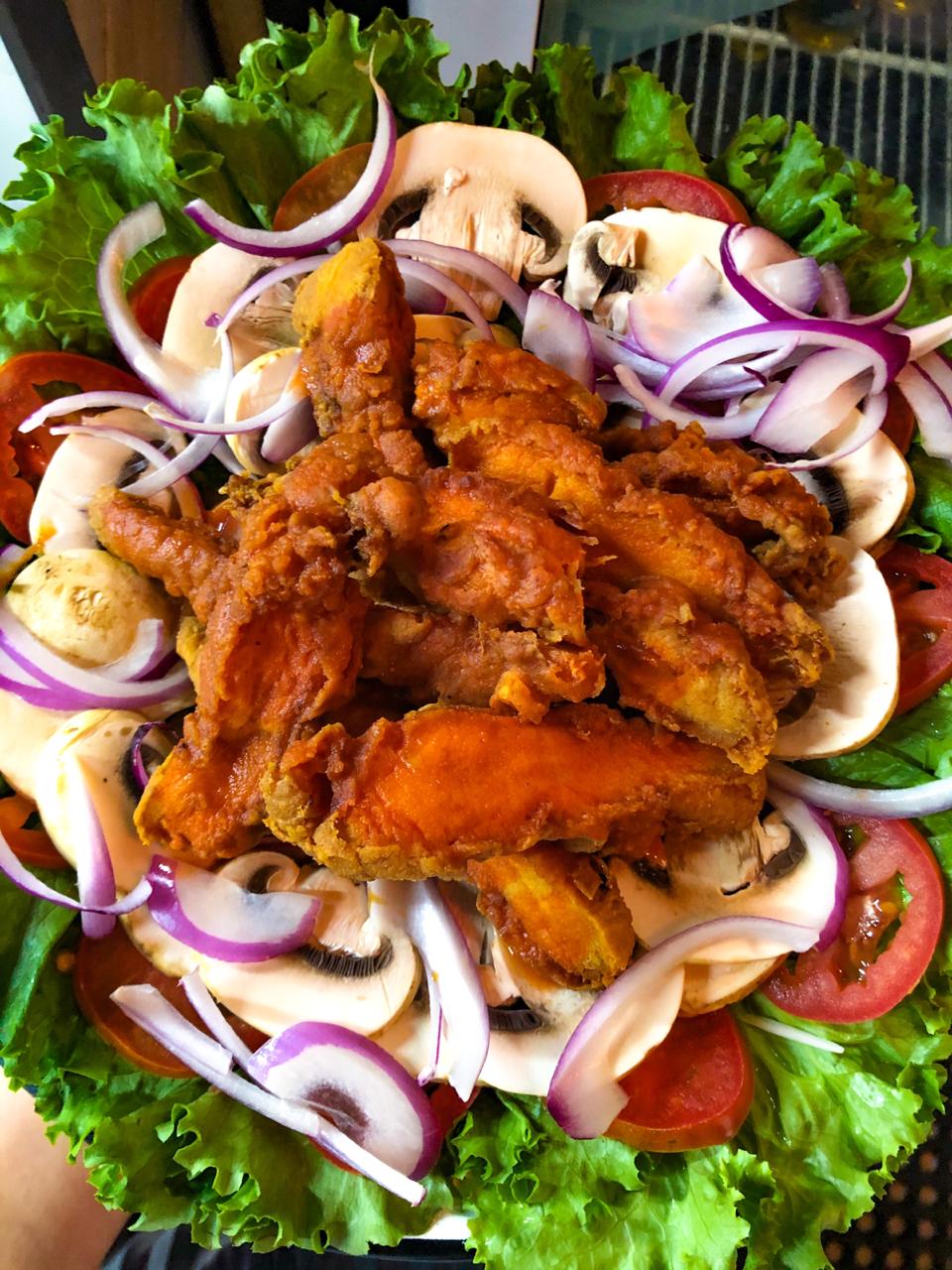 Botana de papa dorada con salchicha, cuero y pepinos.