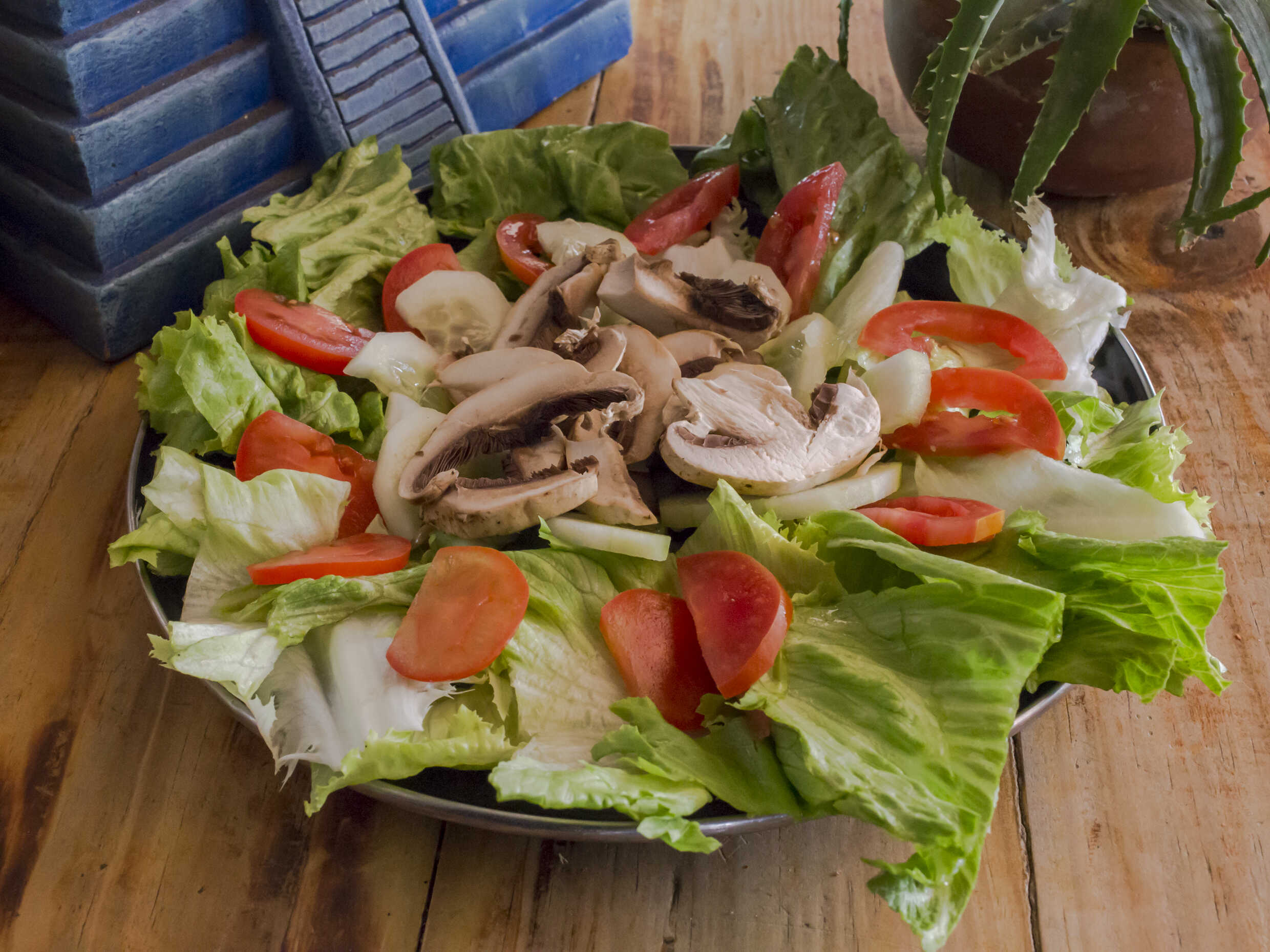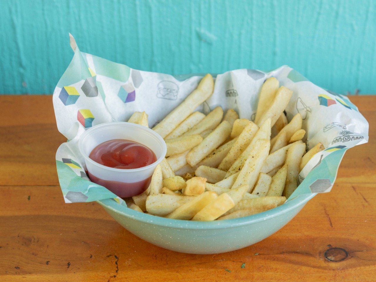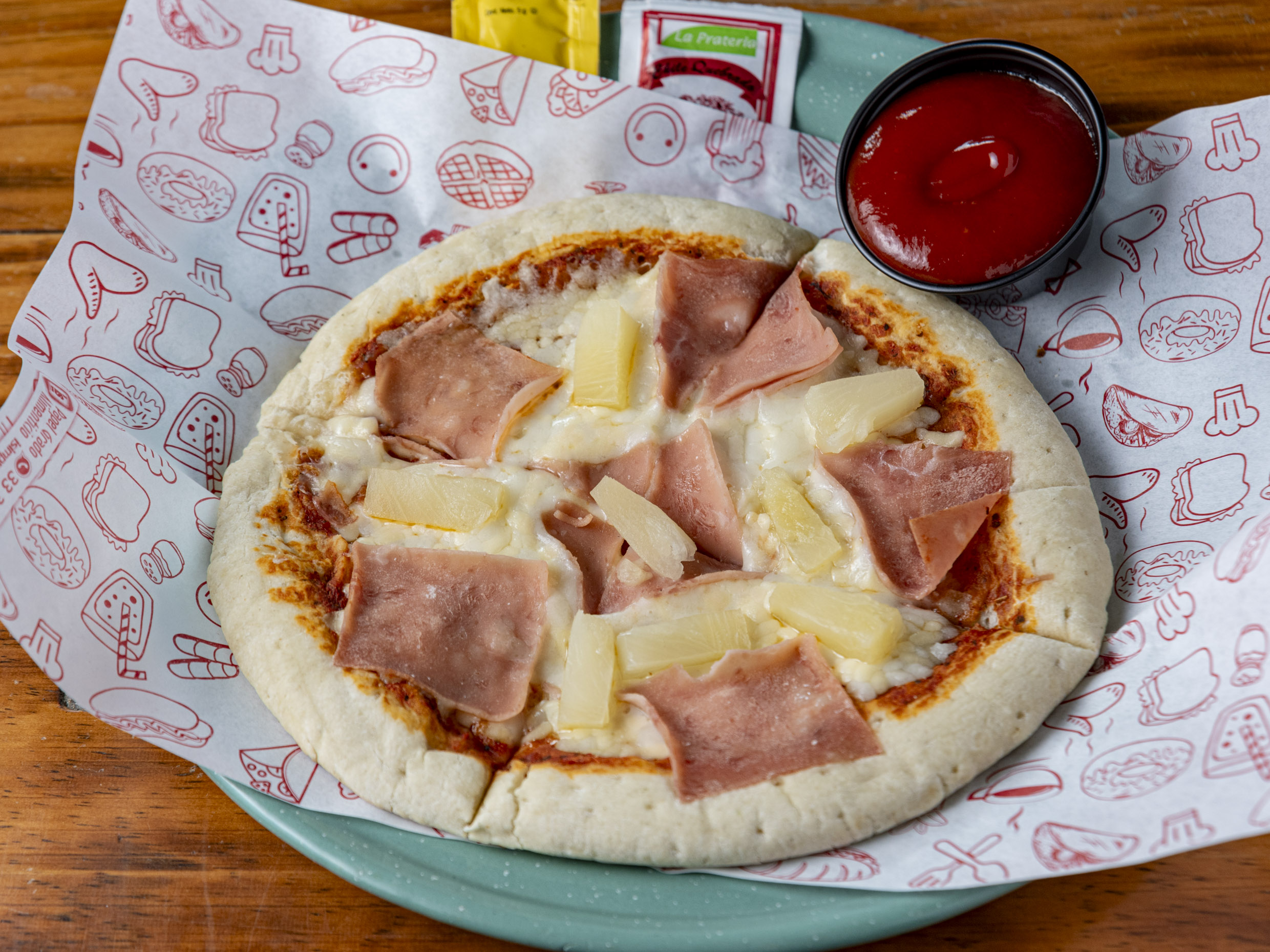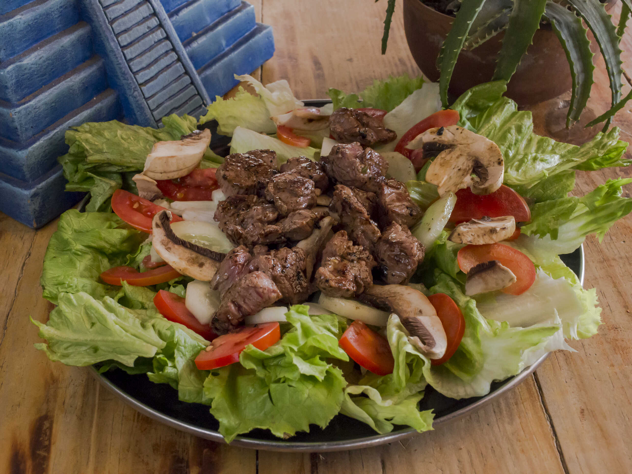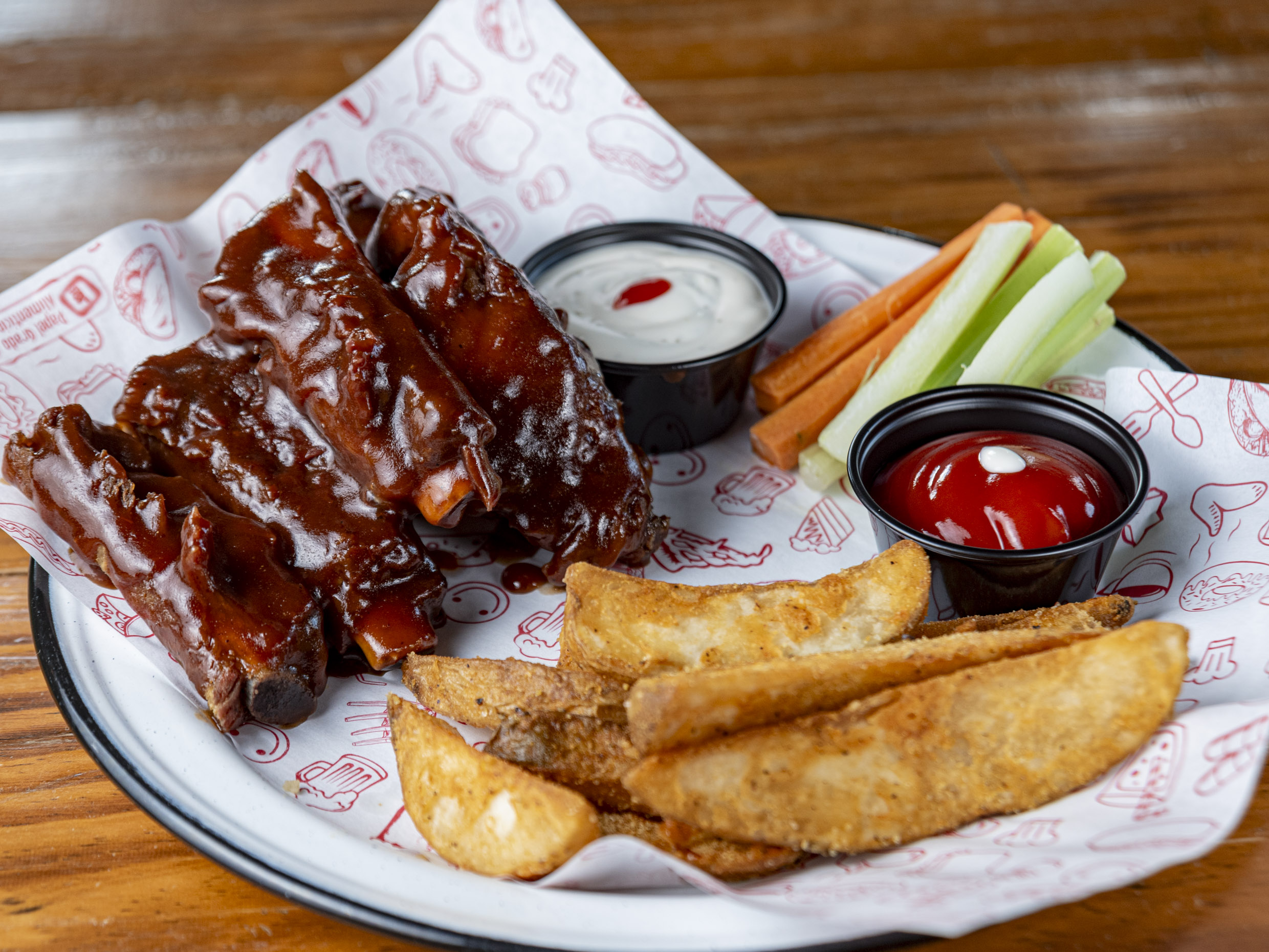 Botana de papa dorada con salchicha, cuero y pepinos.