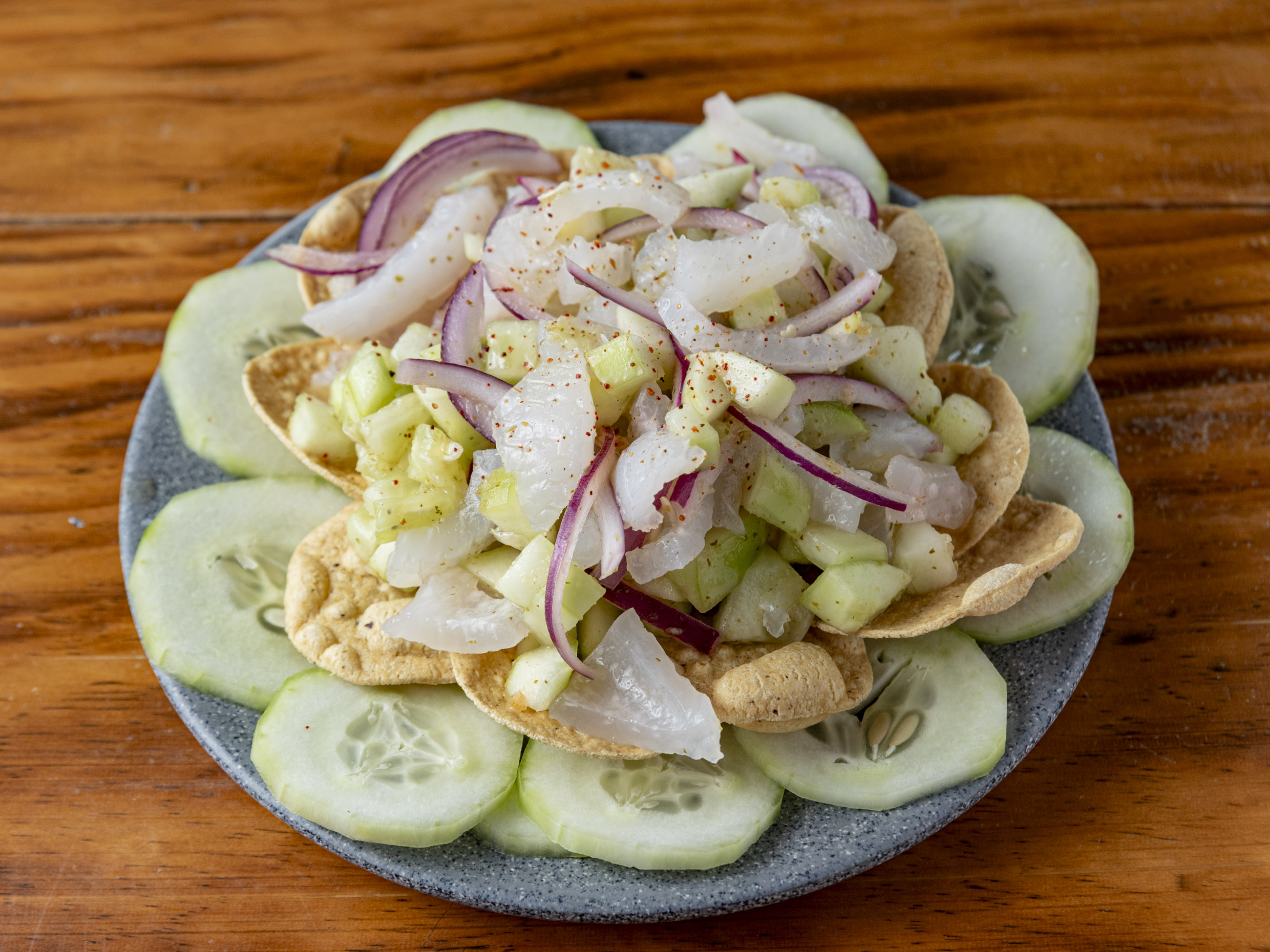 Botana de Tostitos con cuerito, salchicha y pepinos.