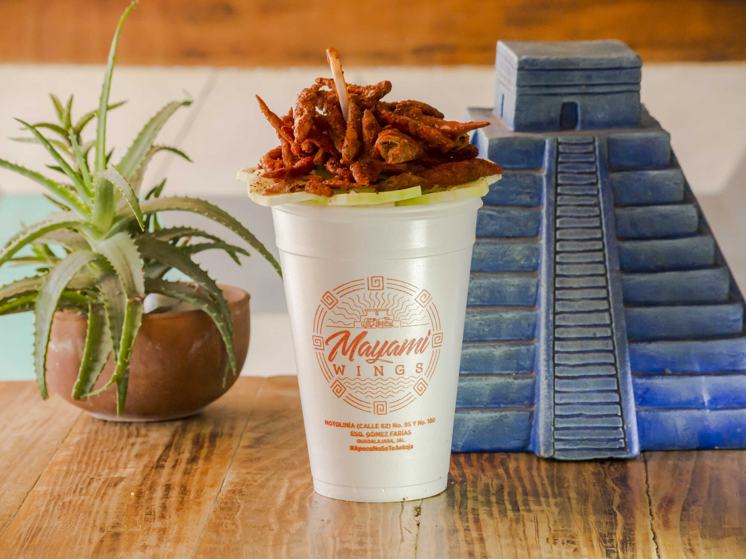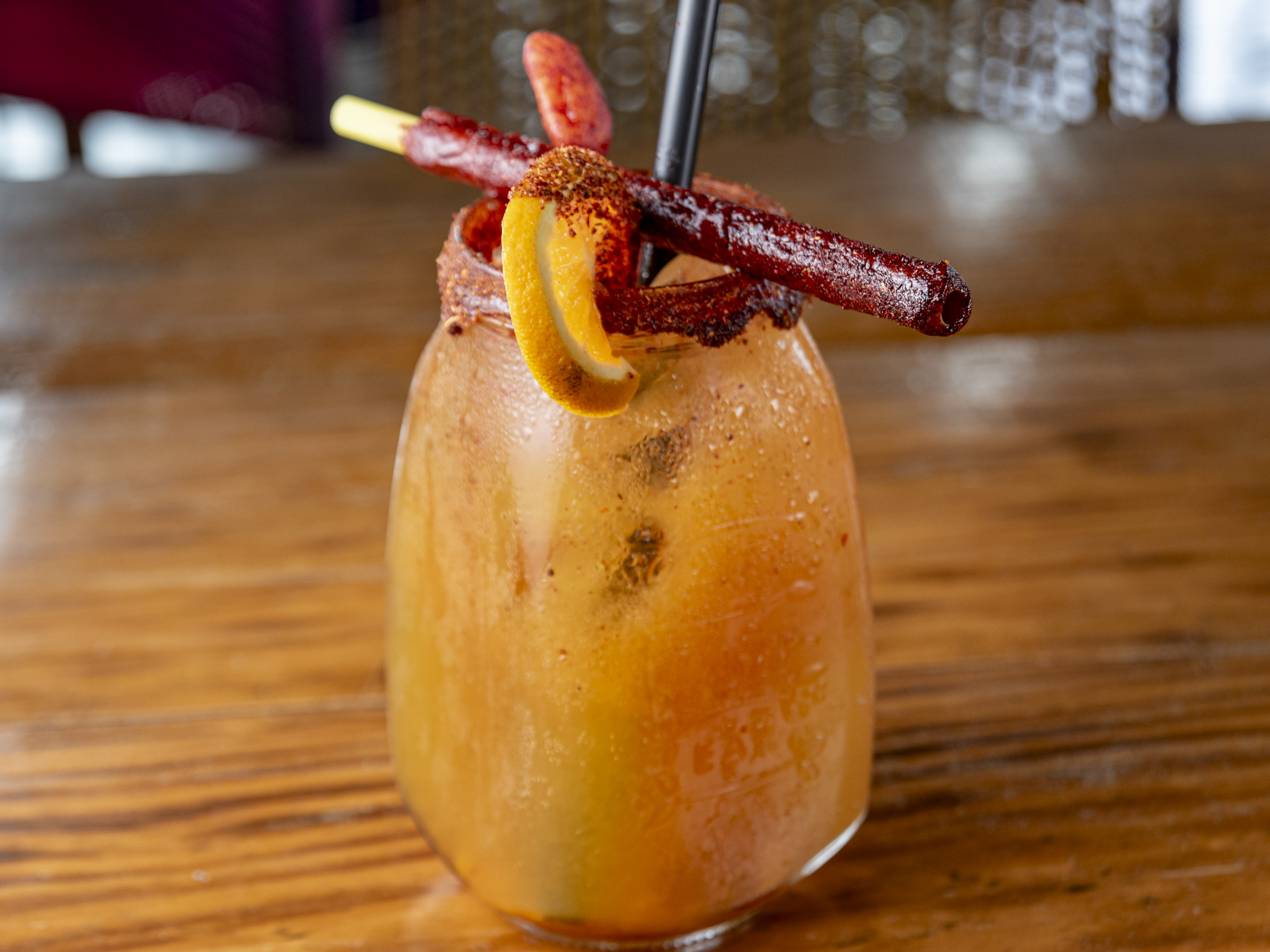 Michelada con papas sabor jalapeño, salchicha, cueritos y pepino.