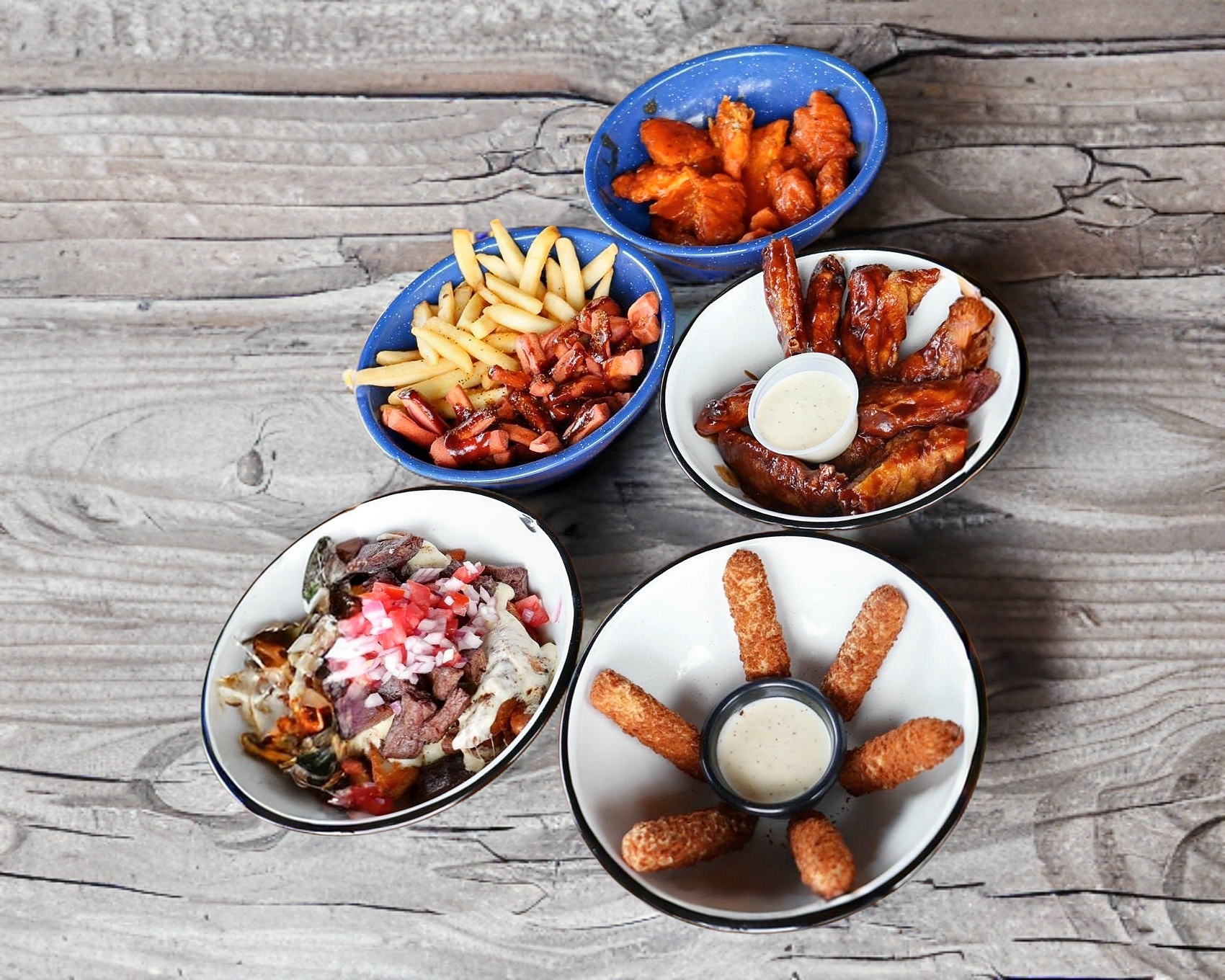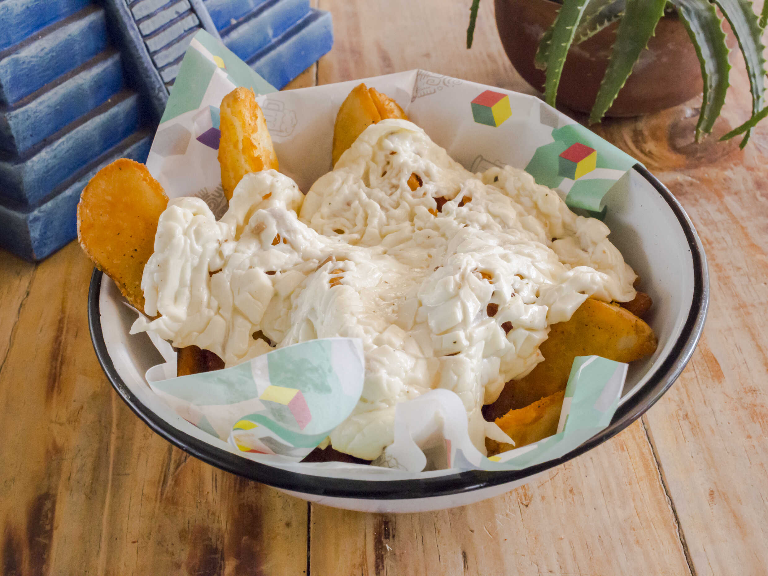 Papas gajo con queso, arrachera y pico de gallo.