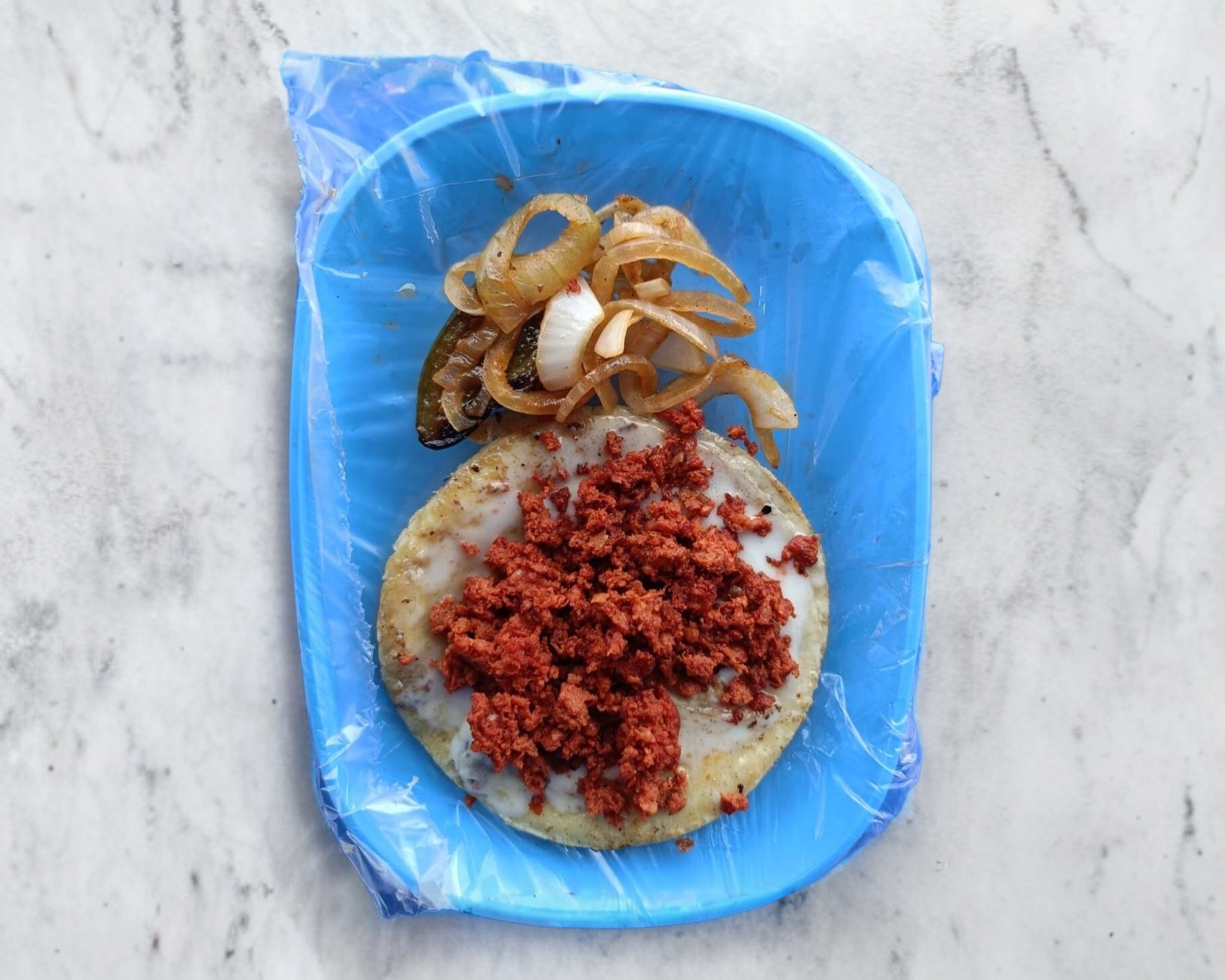 Delicioso taco de chorizo acompañado de sus aditamentos.