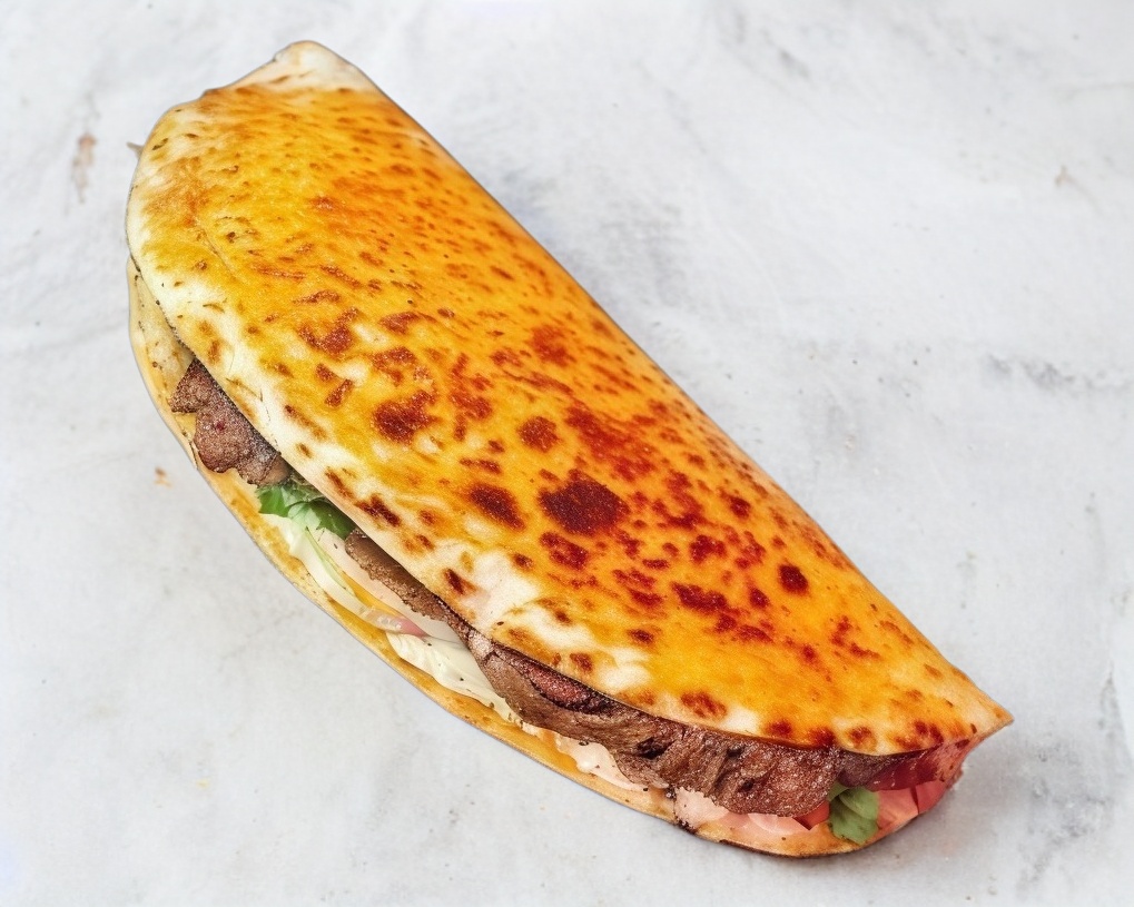 Taco de bistec gratinado con queso con sus respectivo aditamentos.