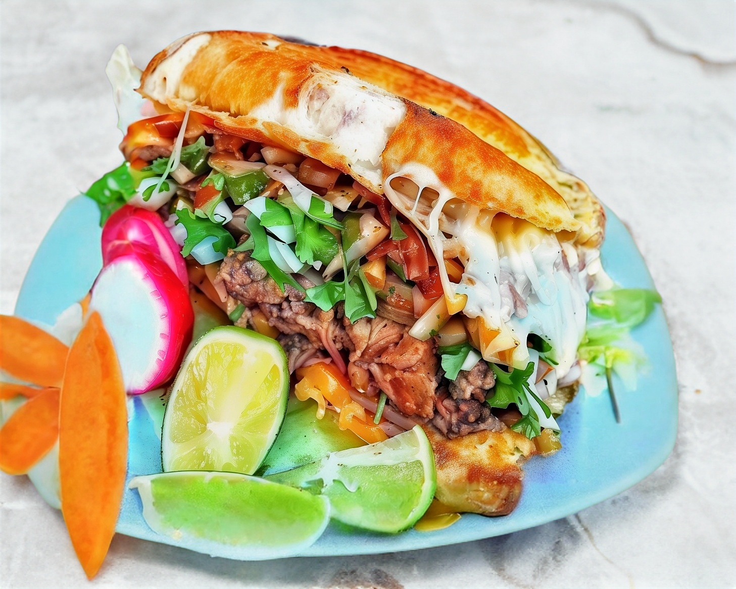 Delicioso lonche relleno de jugosa birria,aditamentos: cebolla picada, cilantro fresco, salsa picante y limón