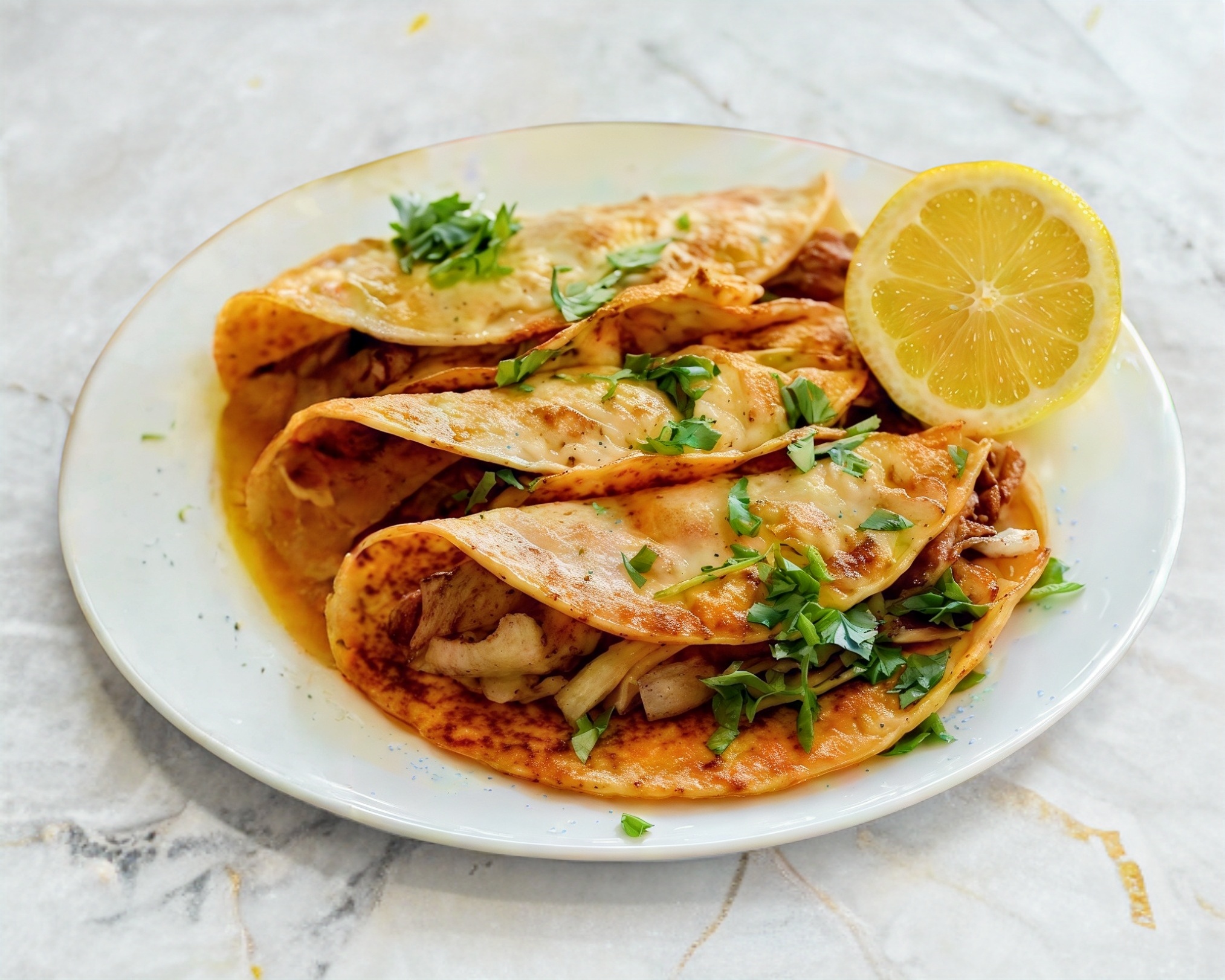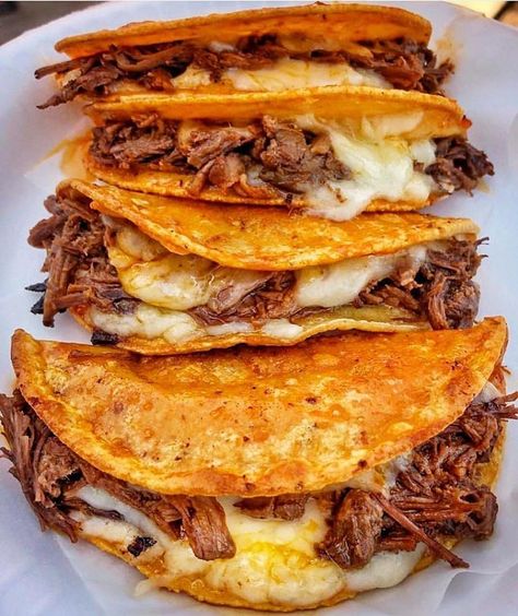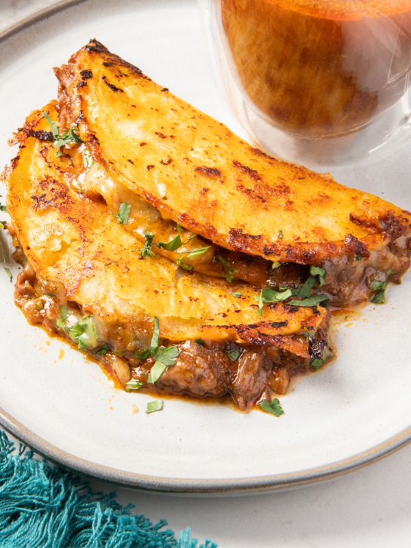 Quesabirria de res Una deliciosa tortilla dorada y crujiente, rellena de birria de res jugosa y queso fundido, servida con cebolla picada, cilantro fresco