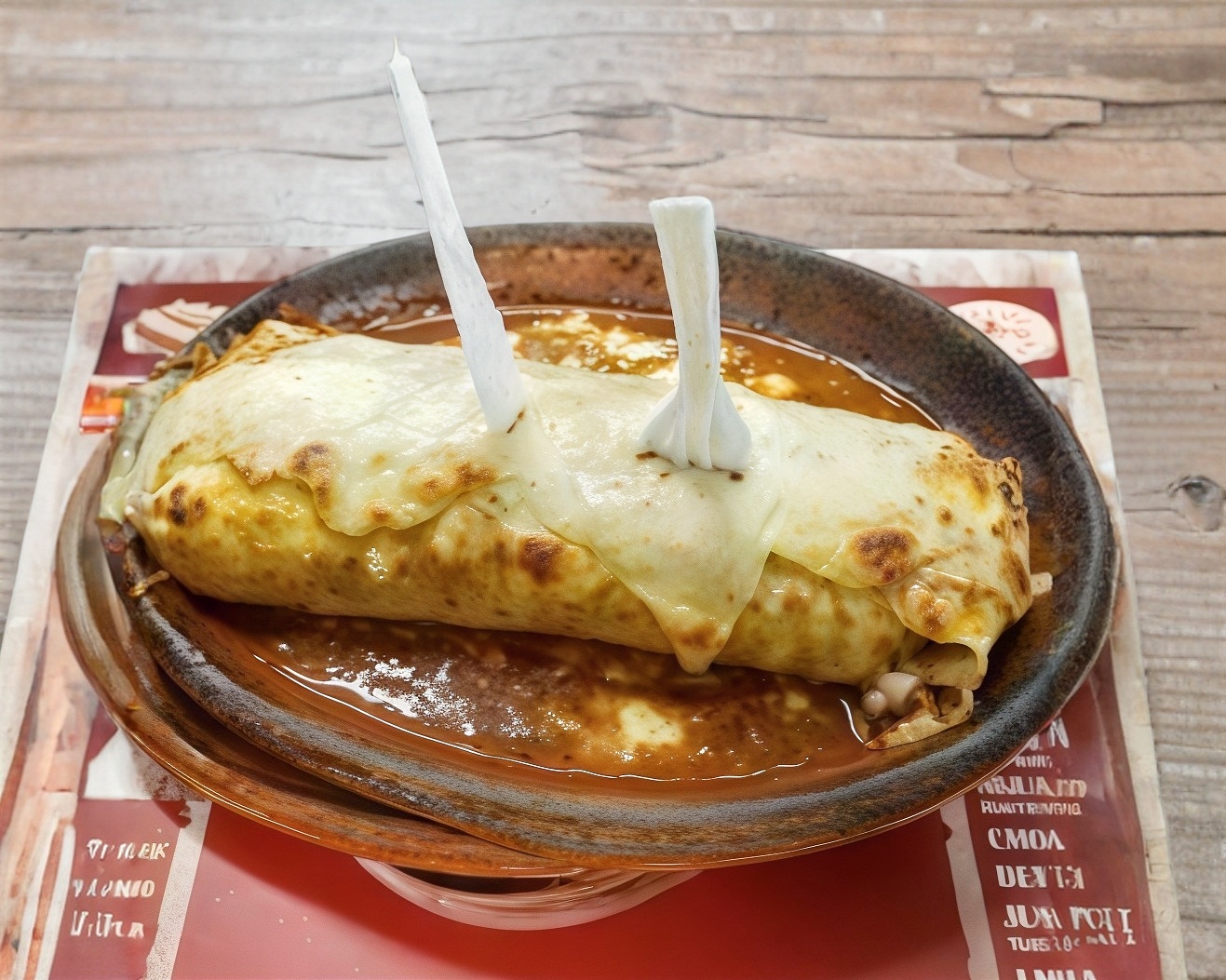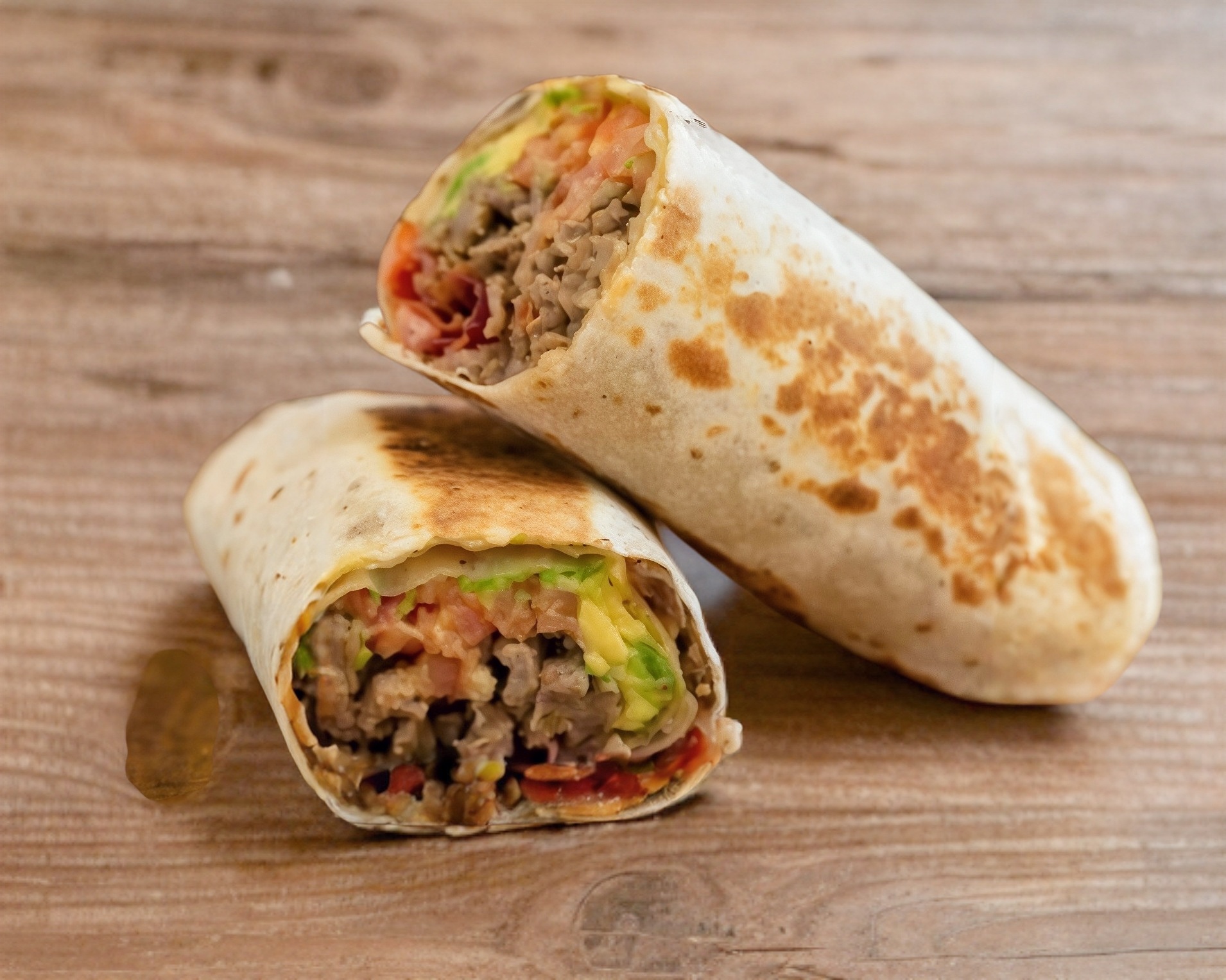 Gran tortilla de harina con carne de bistec y chorizo picada, frijoles de la olla, cilantro cebolla y guacamole con salsa picante aparte, peso aproximado 450 g.
