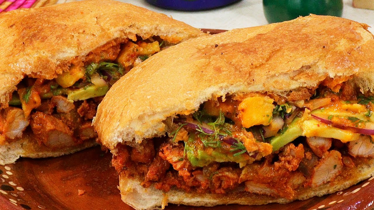 Telera con cochinita, jamón, queso mozzarella, queso amarillo, lechuga, aguacate, cebolla morada y chile jalapeño.