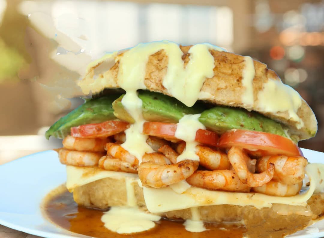 Telera con camarones y carne asada, queso mozzarella, chipotle, lechuga, aguacate, jitomate, cebolla y chile güero.