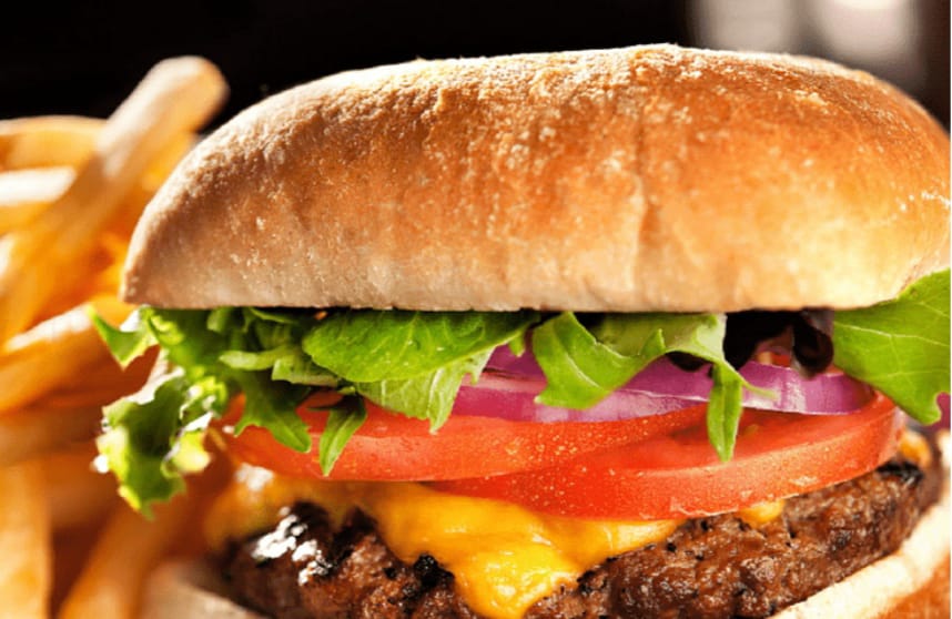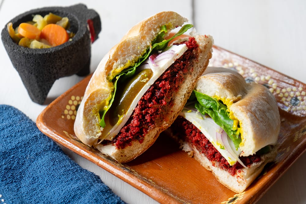 Telera con carne de hamburguesa, queso mozzarella, mayonesa, lechuga, aguacate, jitomate, cebolla y chile güero.