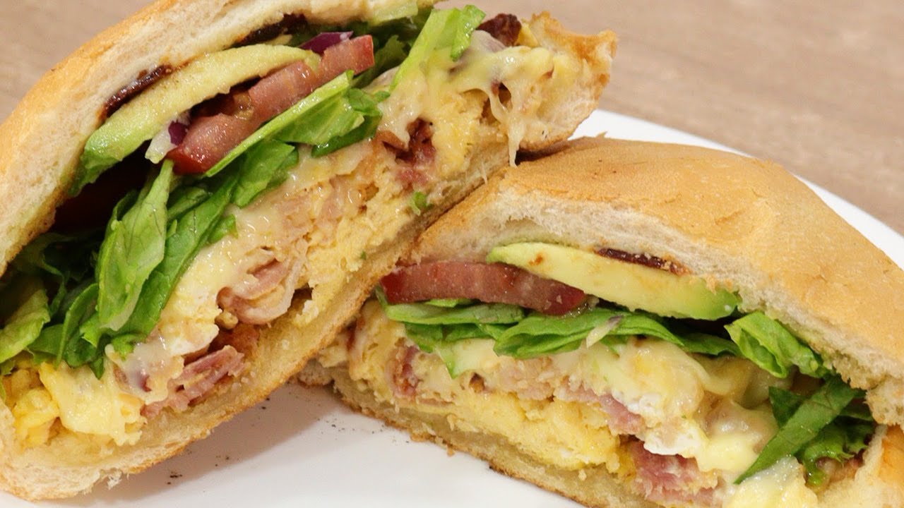 Telera con 3 huevos revueltos, tocino, queso mozzarella, chipotle, lechuga, aguacate, jitomate, cebolla y chile güero.