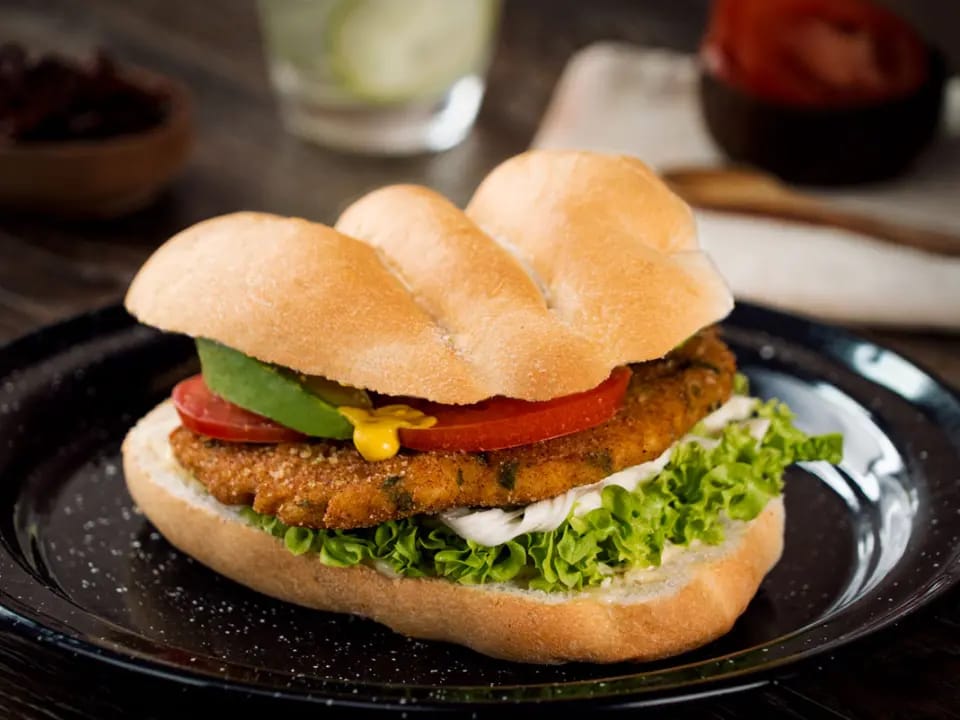 Telera con pollo: (mango habanero, BBQ, búfalo o chipotle), queso mozzarella, lechuga, aguacate, jitomate, cebolla, chile güero.