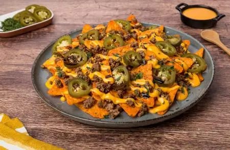 110 g De nachos con queso amarillo, tocino, carne (res, pastor o mixta) y jalapeños.