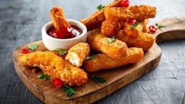 6 Dedos de queso empanizados, acompañados con kétchup.