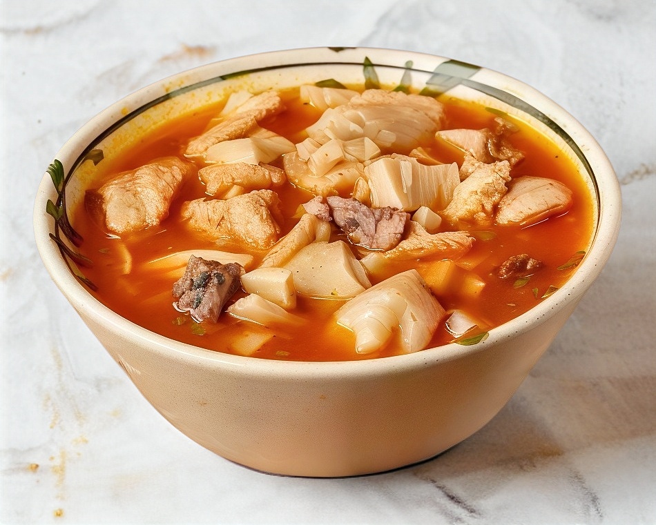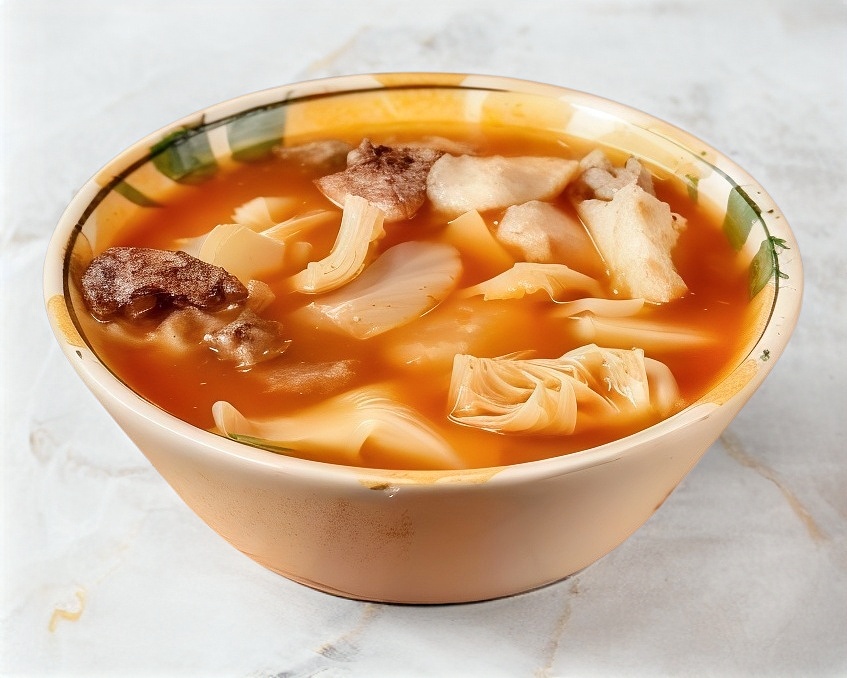 Menudo chico de pedacitos, quesadilla natural recién hecha y bebida a elección.
