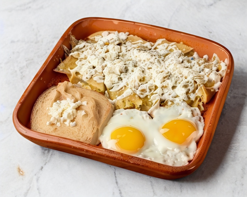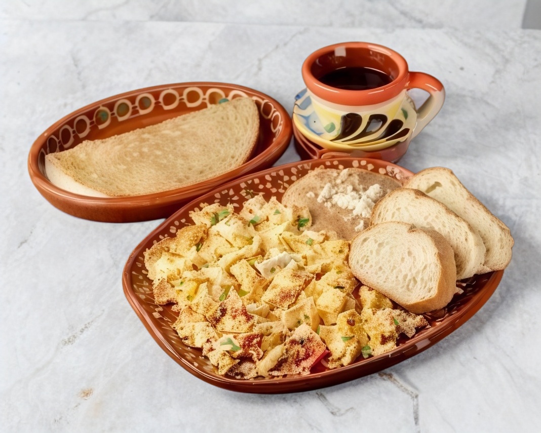 Totopos servidos con salsa roja, sin picante y gratinados, acompañados de 1 pieza de huevo revuelto con jamón y frijoles refritos, 1 café de olla, incluye aparte bolillo, cebolla y crema.
