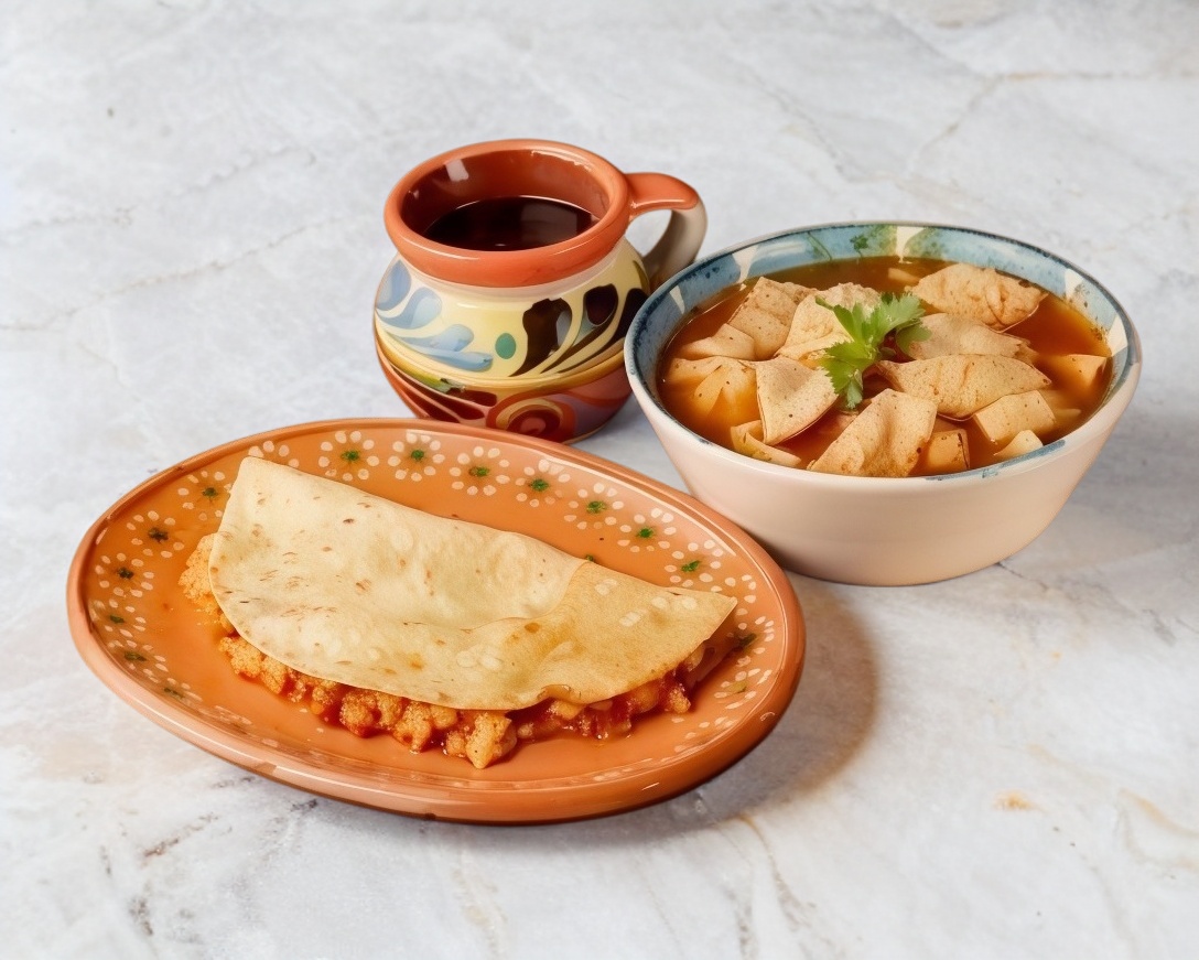 Menudo chico de pedacitos, una quesadilla de chicharrón prensado, un café de olla (355 ml), incluye limón, mejorana, chile seco, cebolla, salsa de la casa y 3 tortillas.