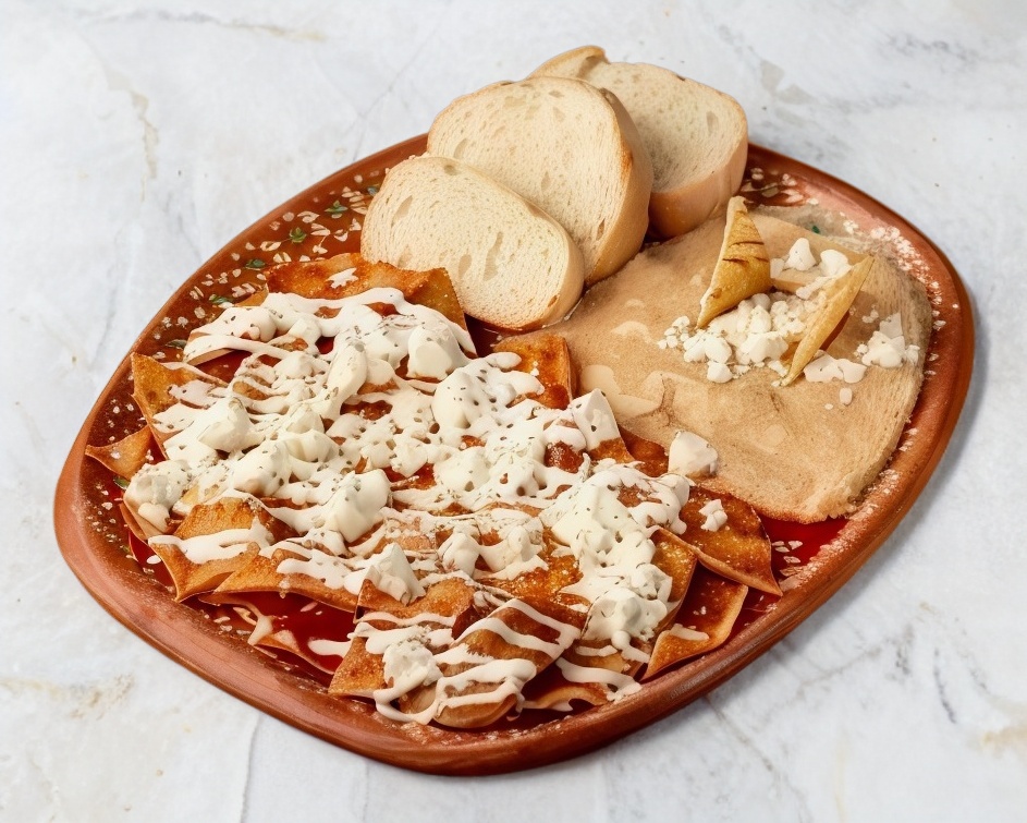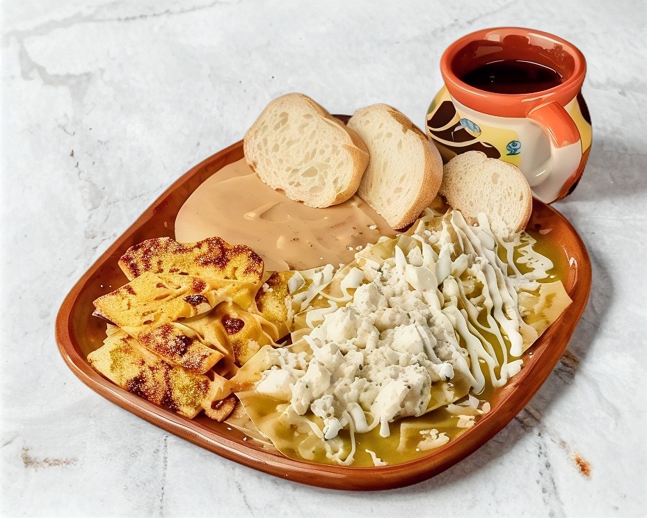 Totopos bañados con salsa de tu elección, gratinados con queso, acompañado con frijoles refritos y bolillo, incluye aparte crema, cebolla y salsa.