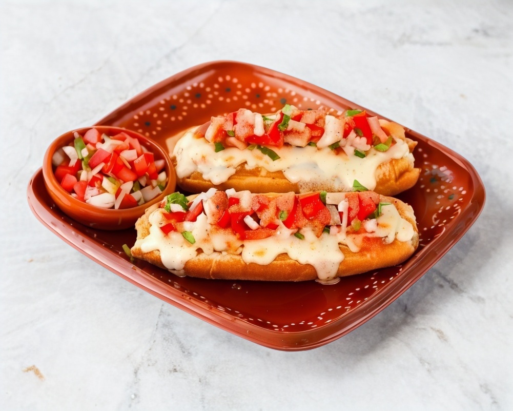 Bolillo en dos piezas, cubierto con frijoles refritos, acompañados con salsa mexicana y tomate (para una persona).