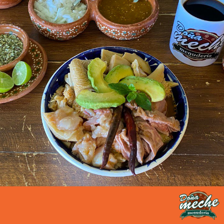 Menudo con pancita, casitas, callo, ranilla, pata y si gusta cuajo también, se acompaña de 4 tortillas recién hechas, chilito de tomate, cebolla, limoncitos, orégano y chile dorado de Yahualica.
