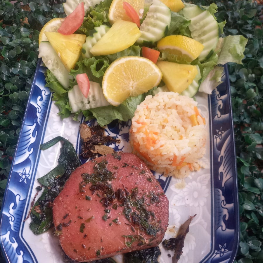 Medallon de Atun marinado con finas hierbas, sellado con aceite de oliva sobre una cama de espinaca