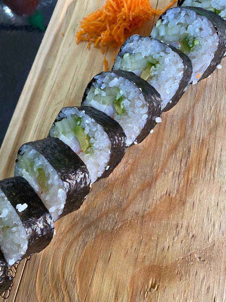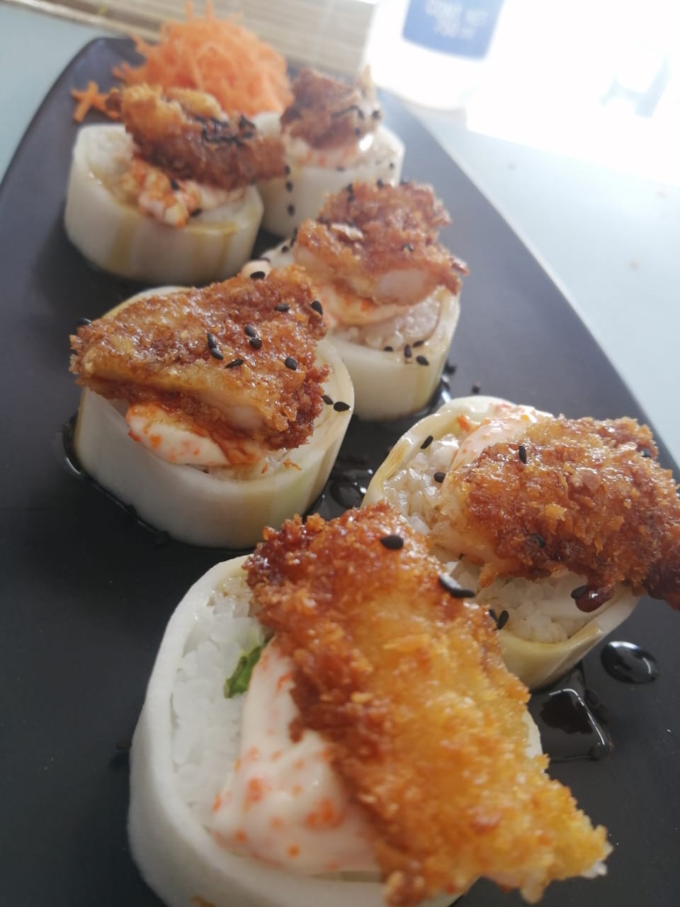 Envuelto en pepino, relleno de aguacate y Philadelphia y arriba aderezo y camarones empanizados.