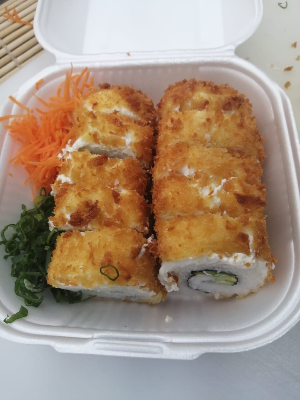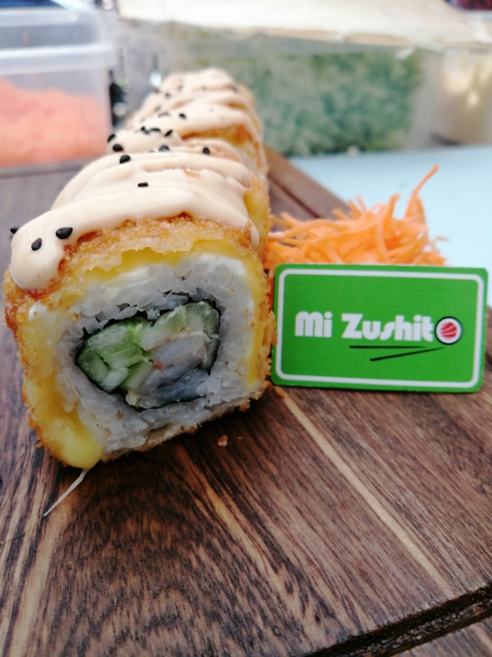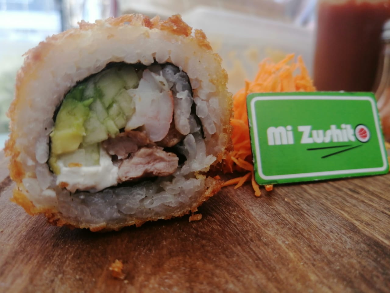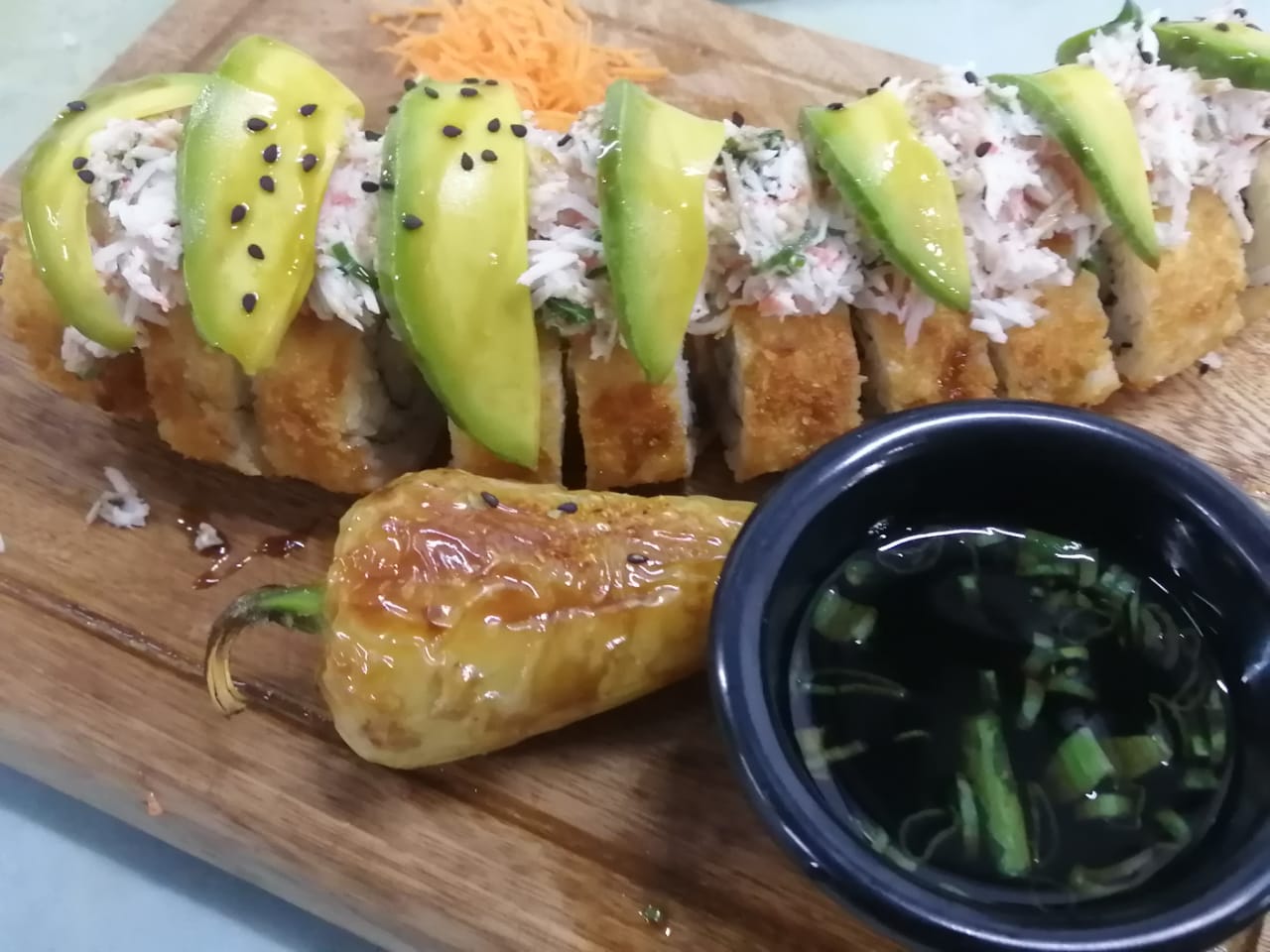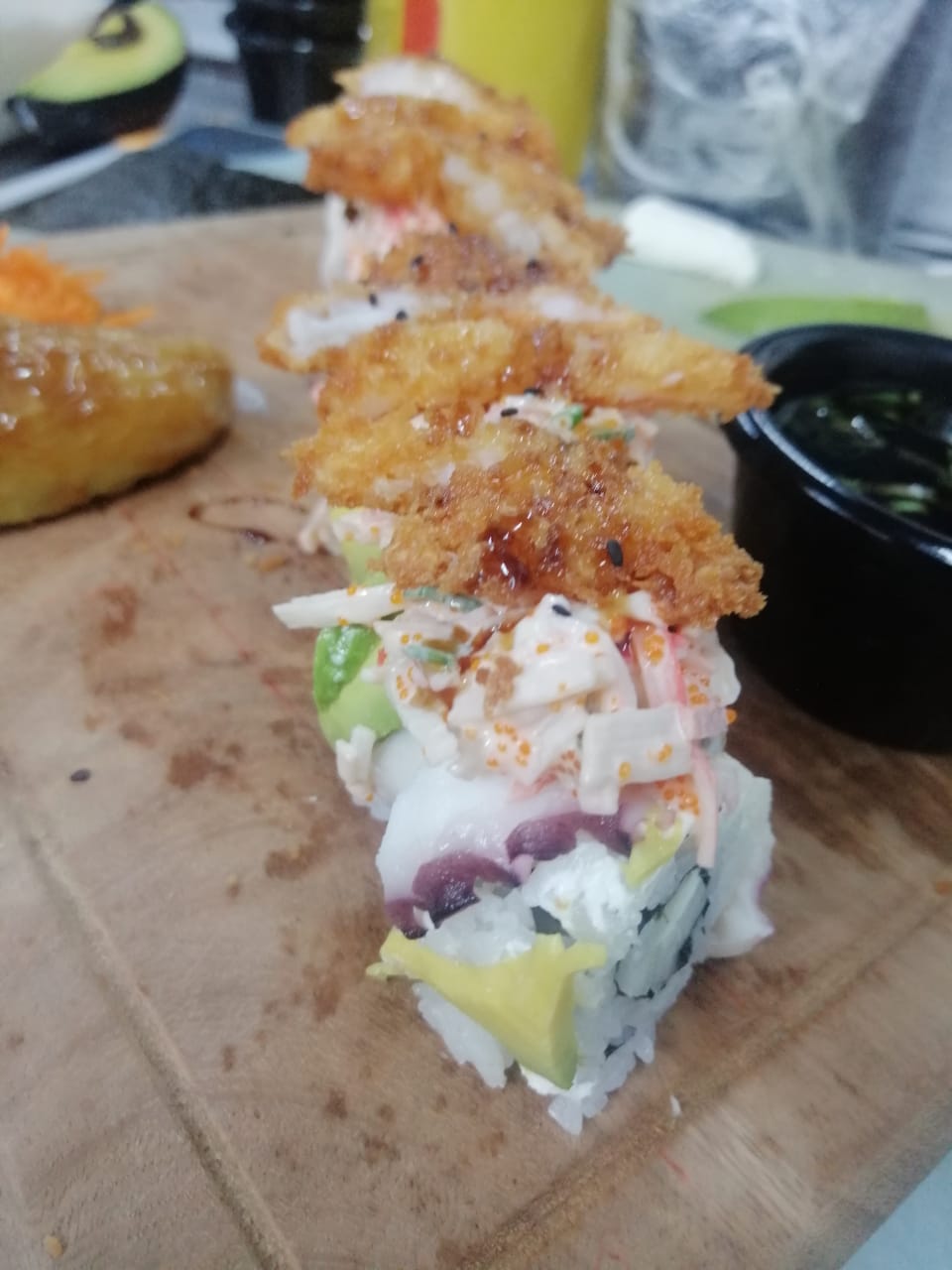 Sushi gigante empanizado relleno con pollo,res,tocino,camarón, con ensalada tampico, Philadelphia,aguacate,pepino