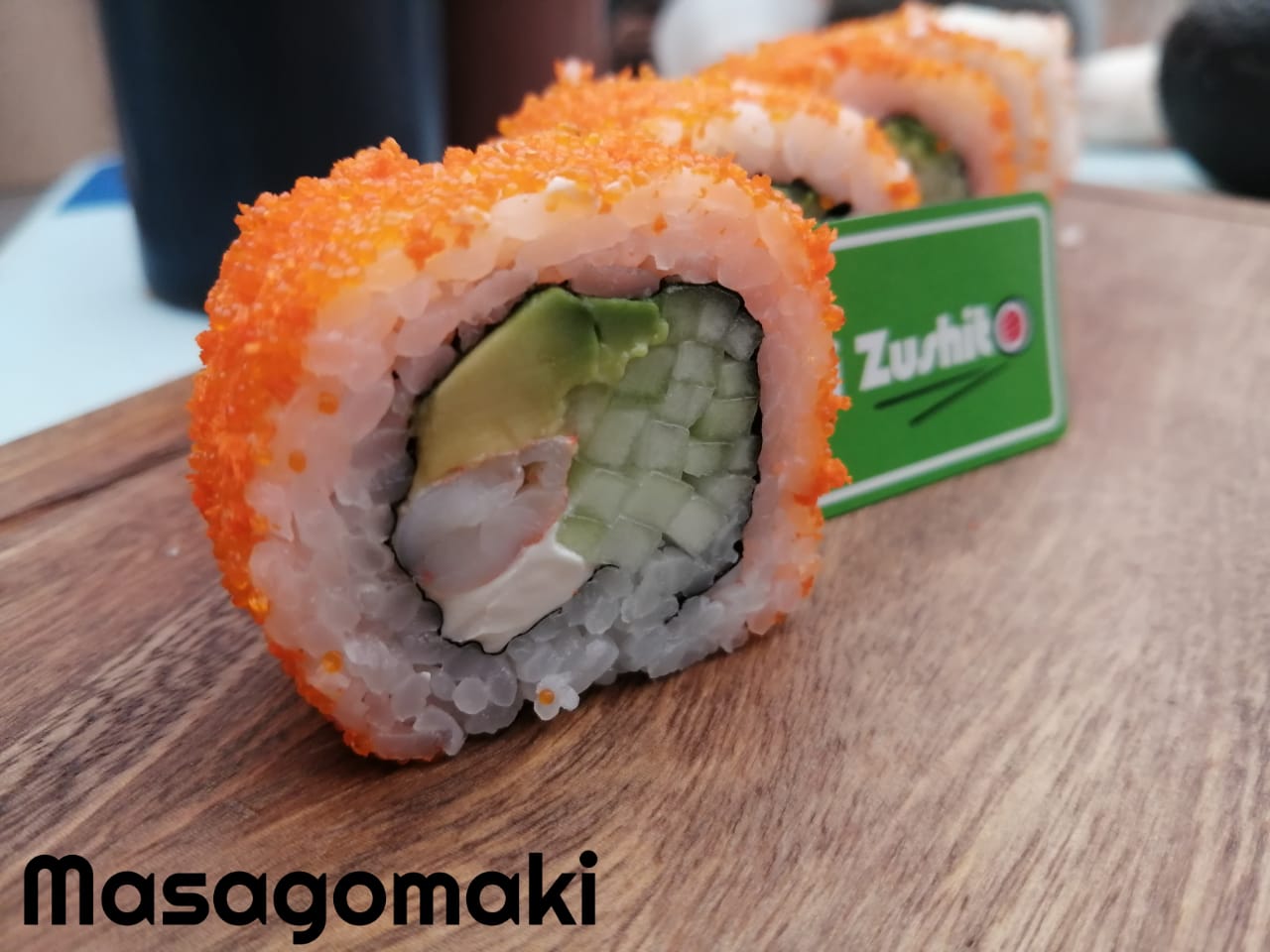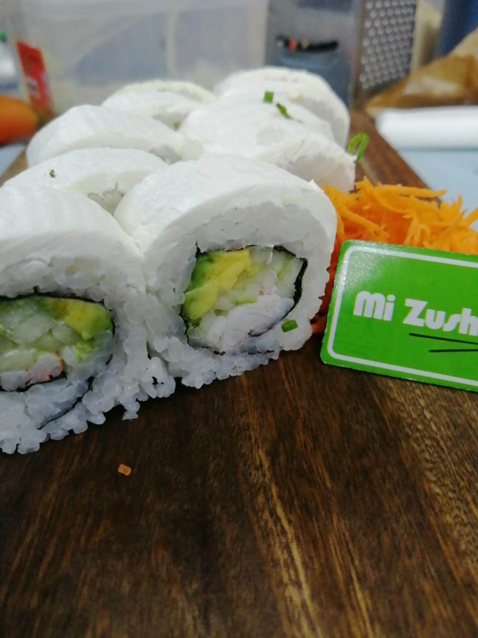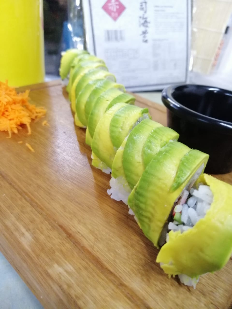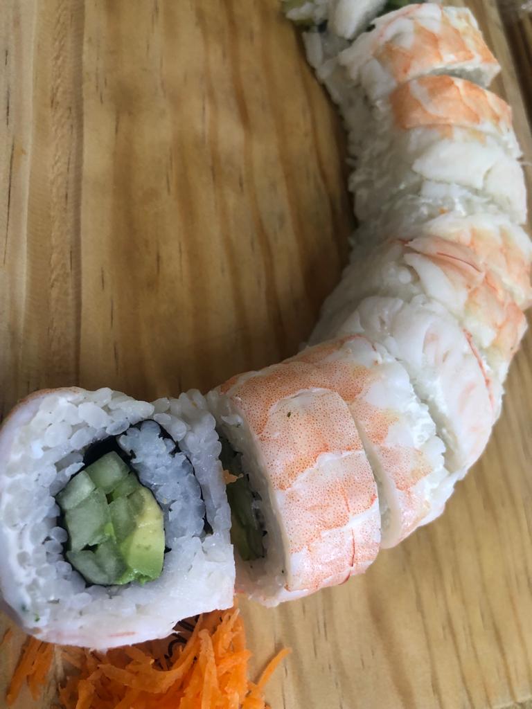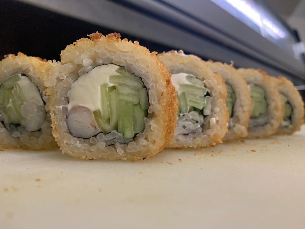 Sushi envuelto en camarones empanizados y aguacate, por dentro pepino y queso Philadelphia.