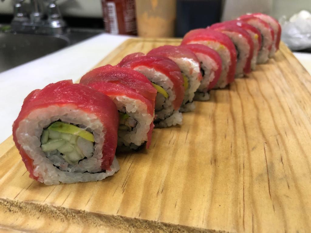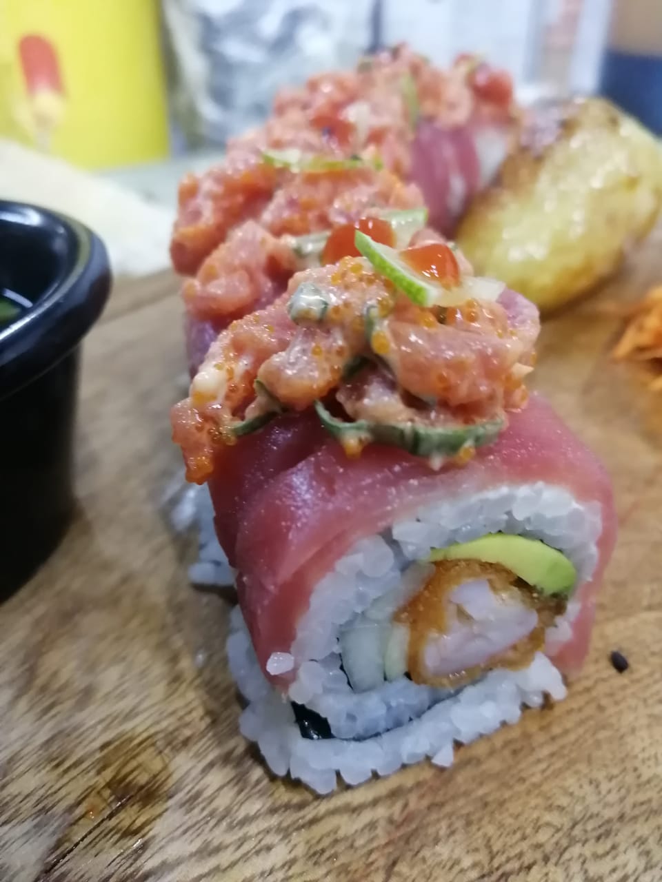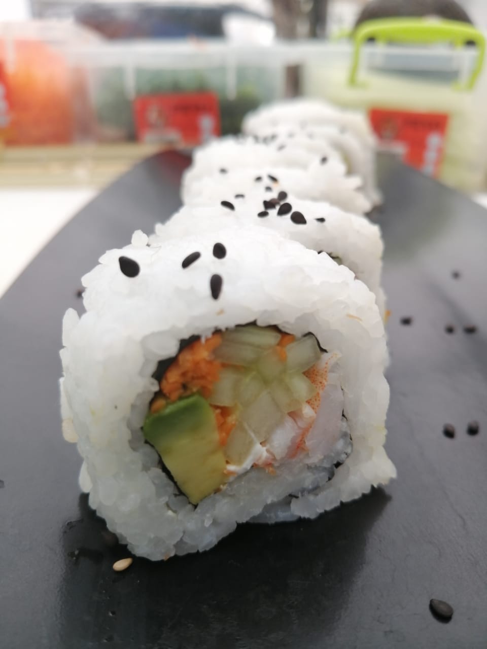 Relleno con camarón, res, philadelphia, aguacate y pepino.