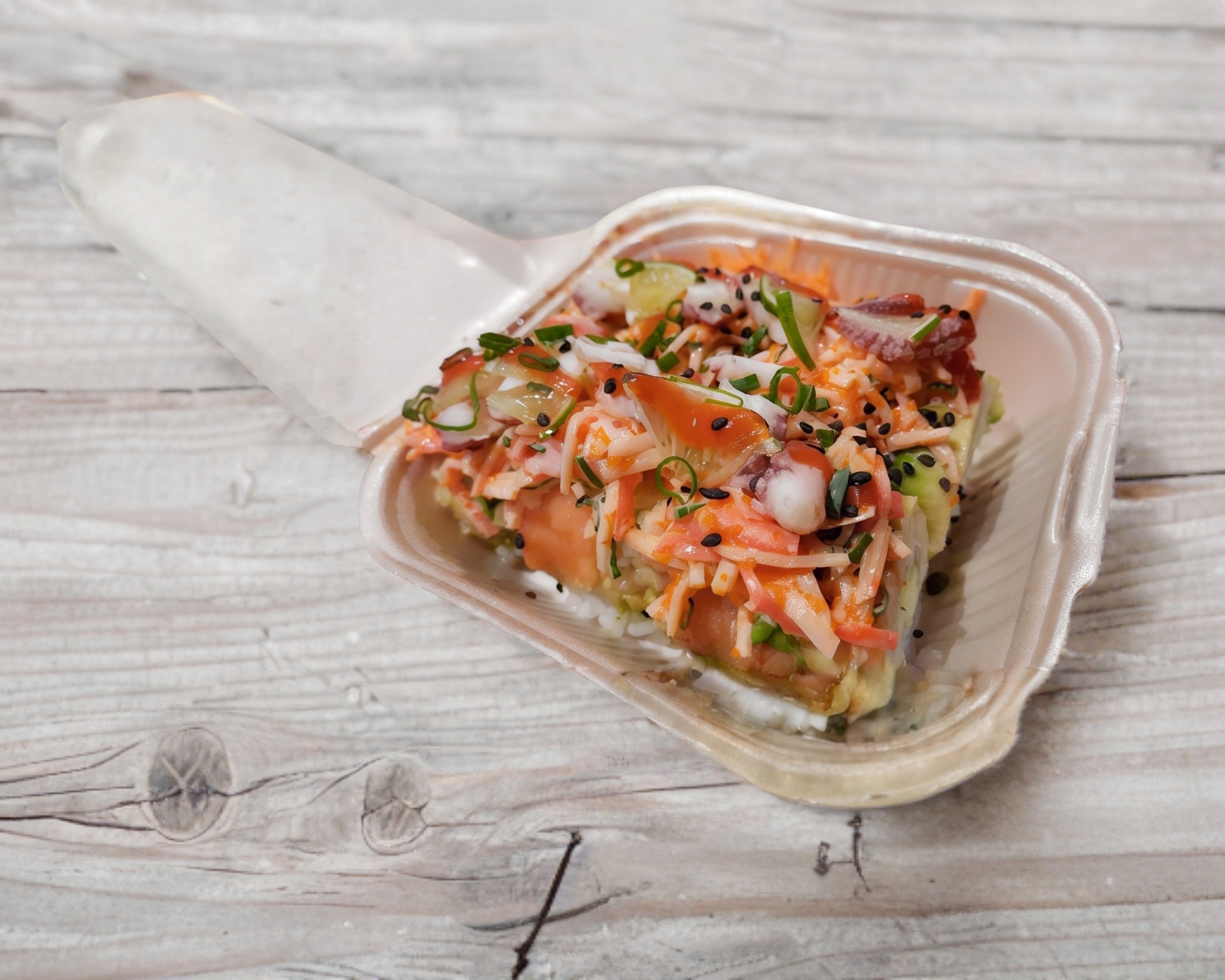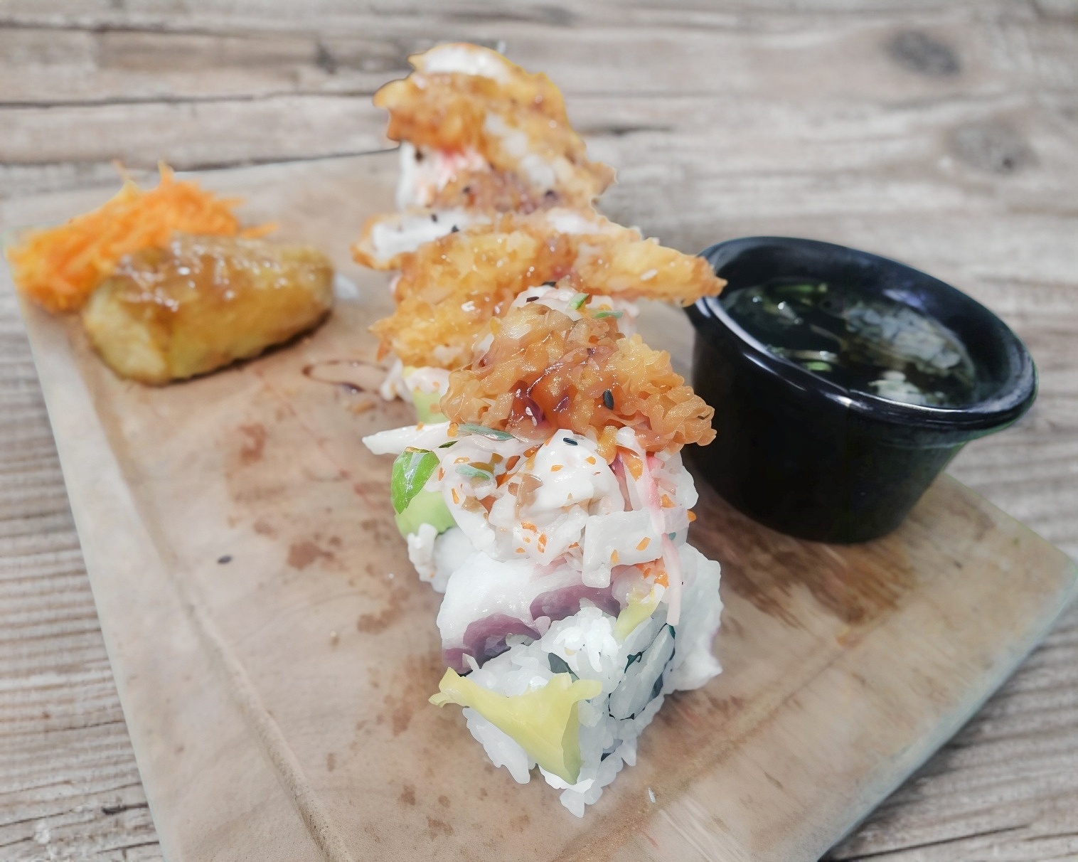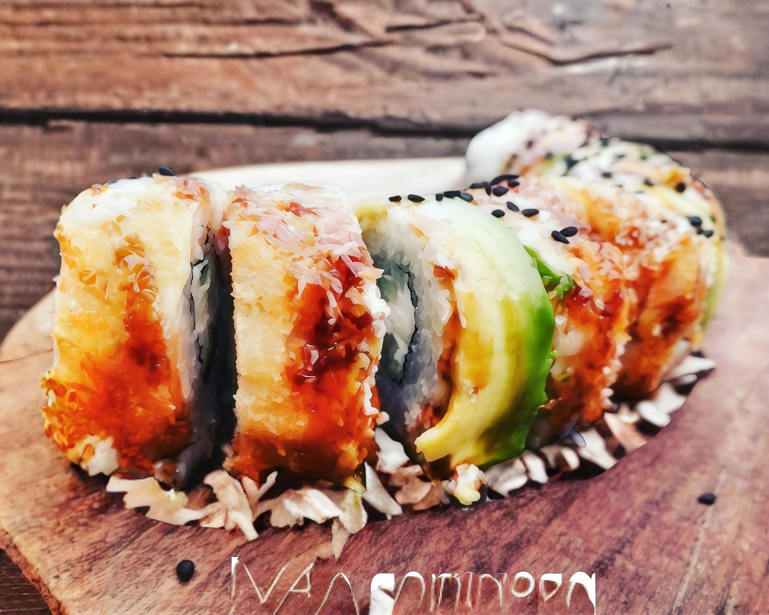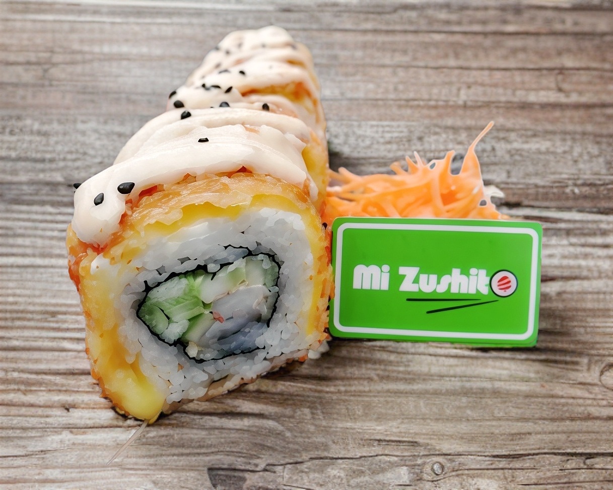 Arroz al vapor preparado con mayonesa, kanikama y masago arriba aguacate, philadelphia,camarones empanizado,salsa de anguila y ajonjolí.