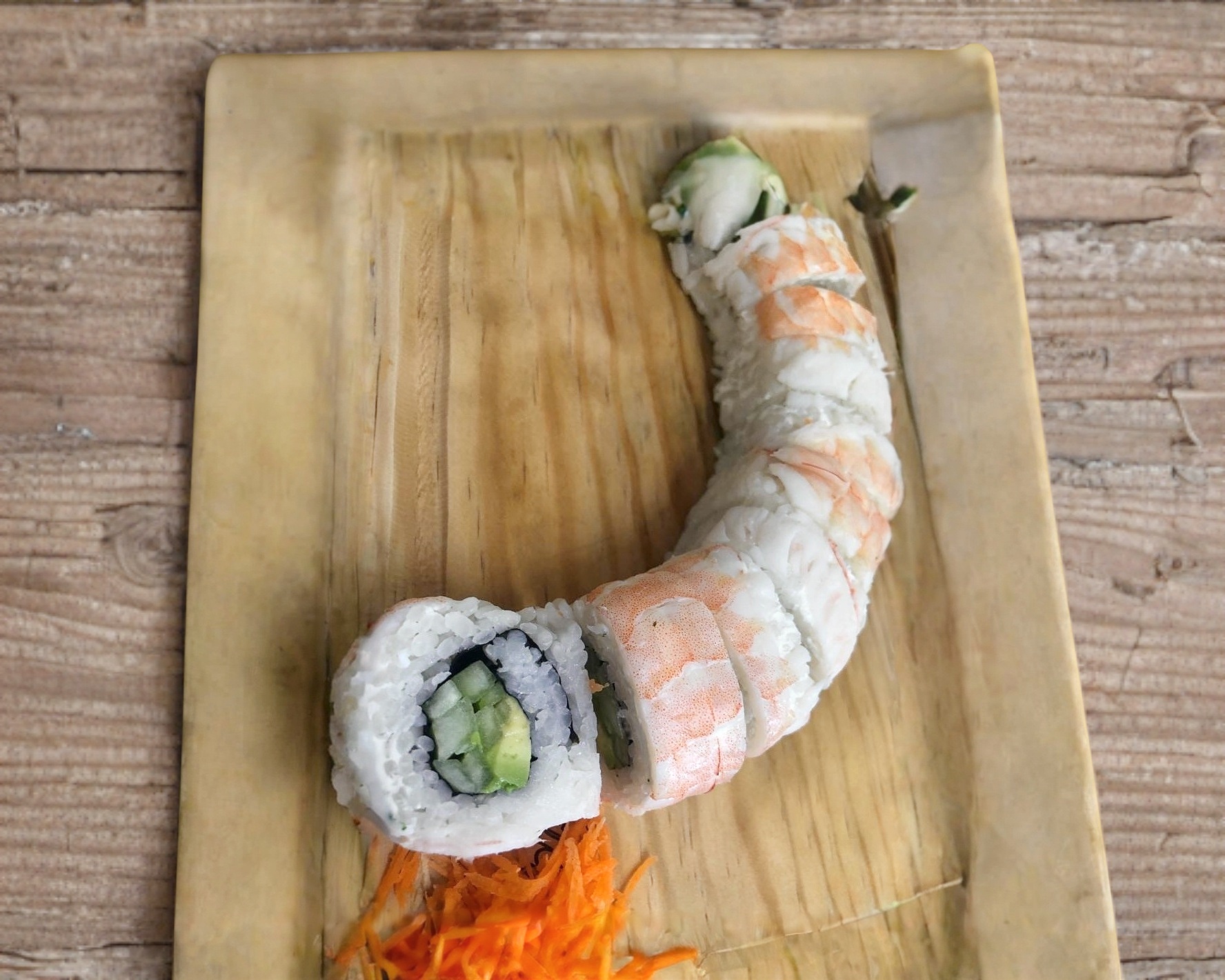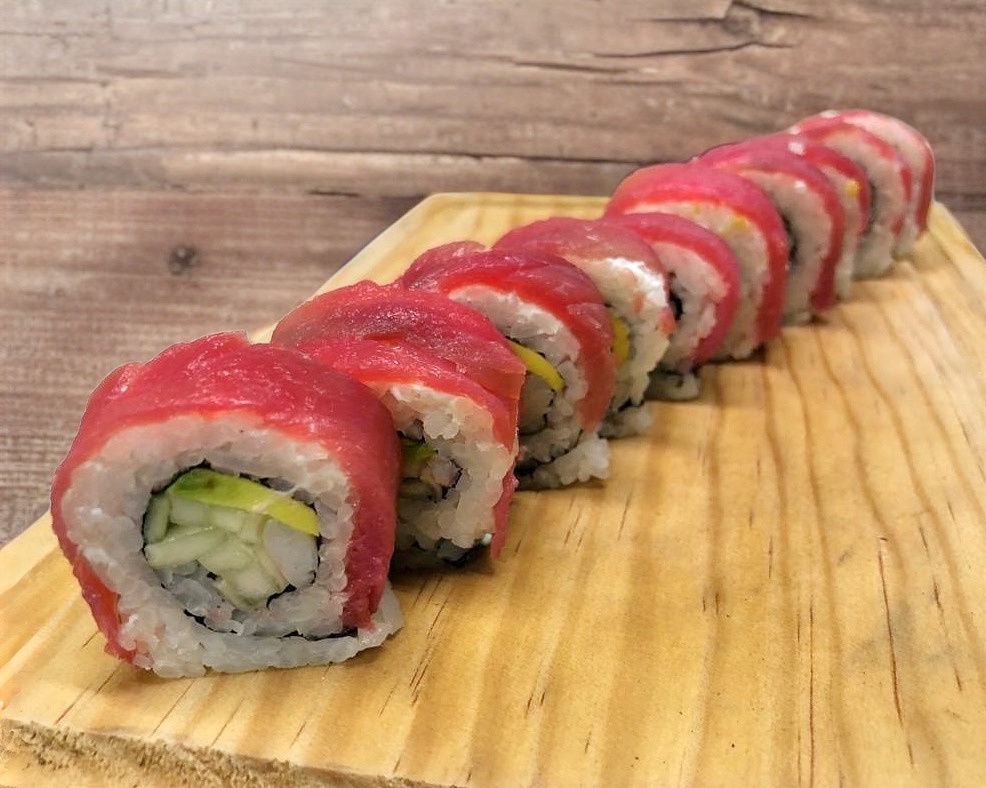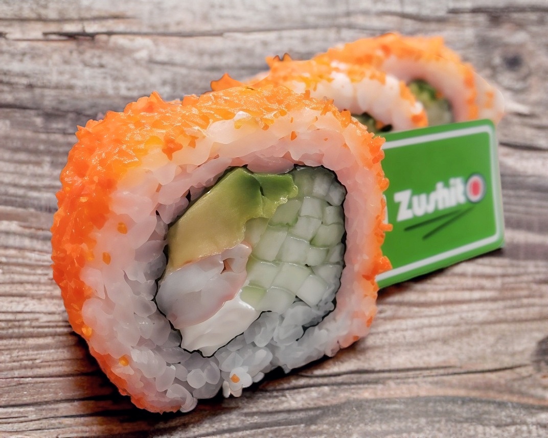 Sushi envuelto en camarones empanizados y aguacate, por dentro pepino y queso Philadelphia.