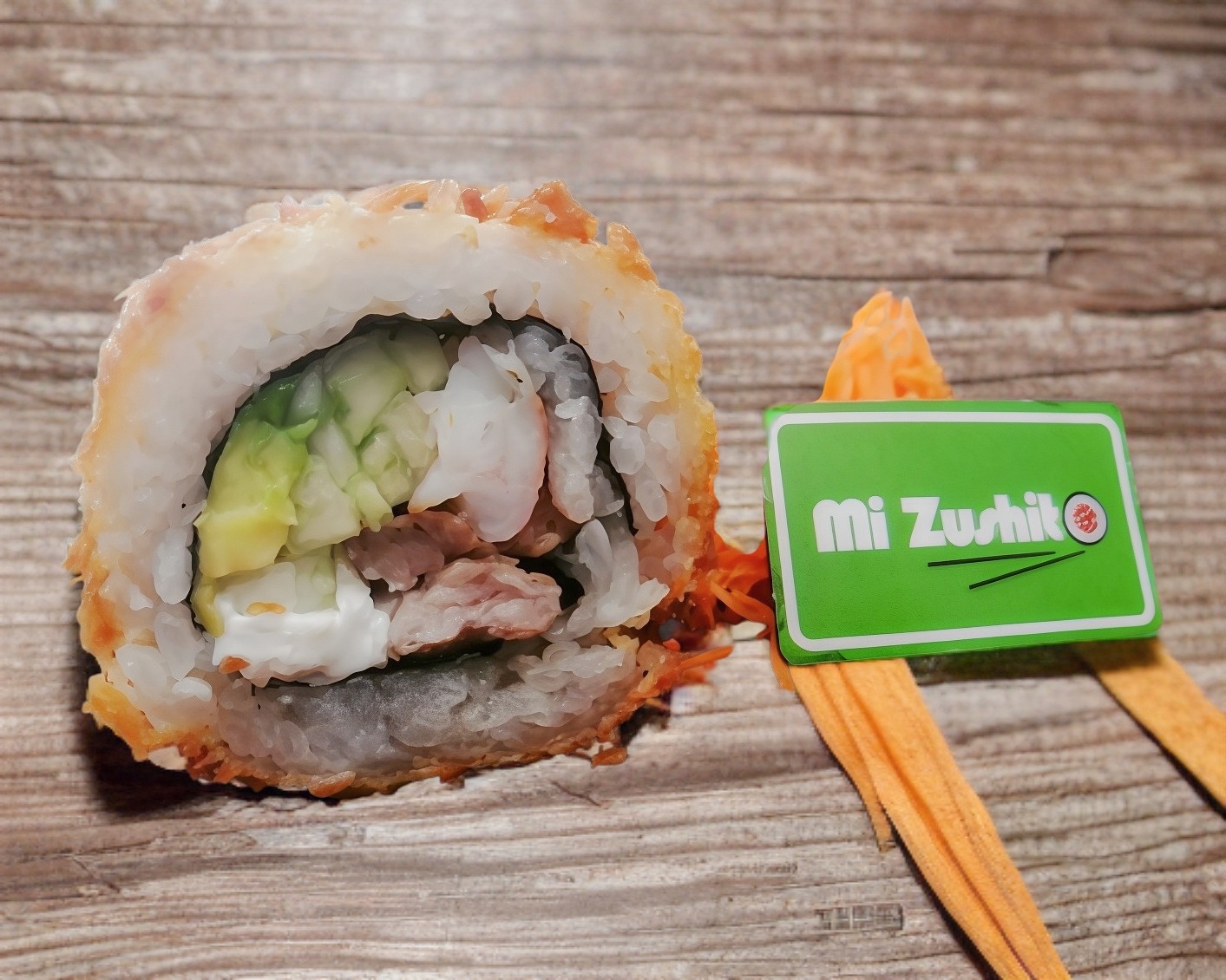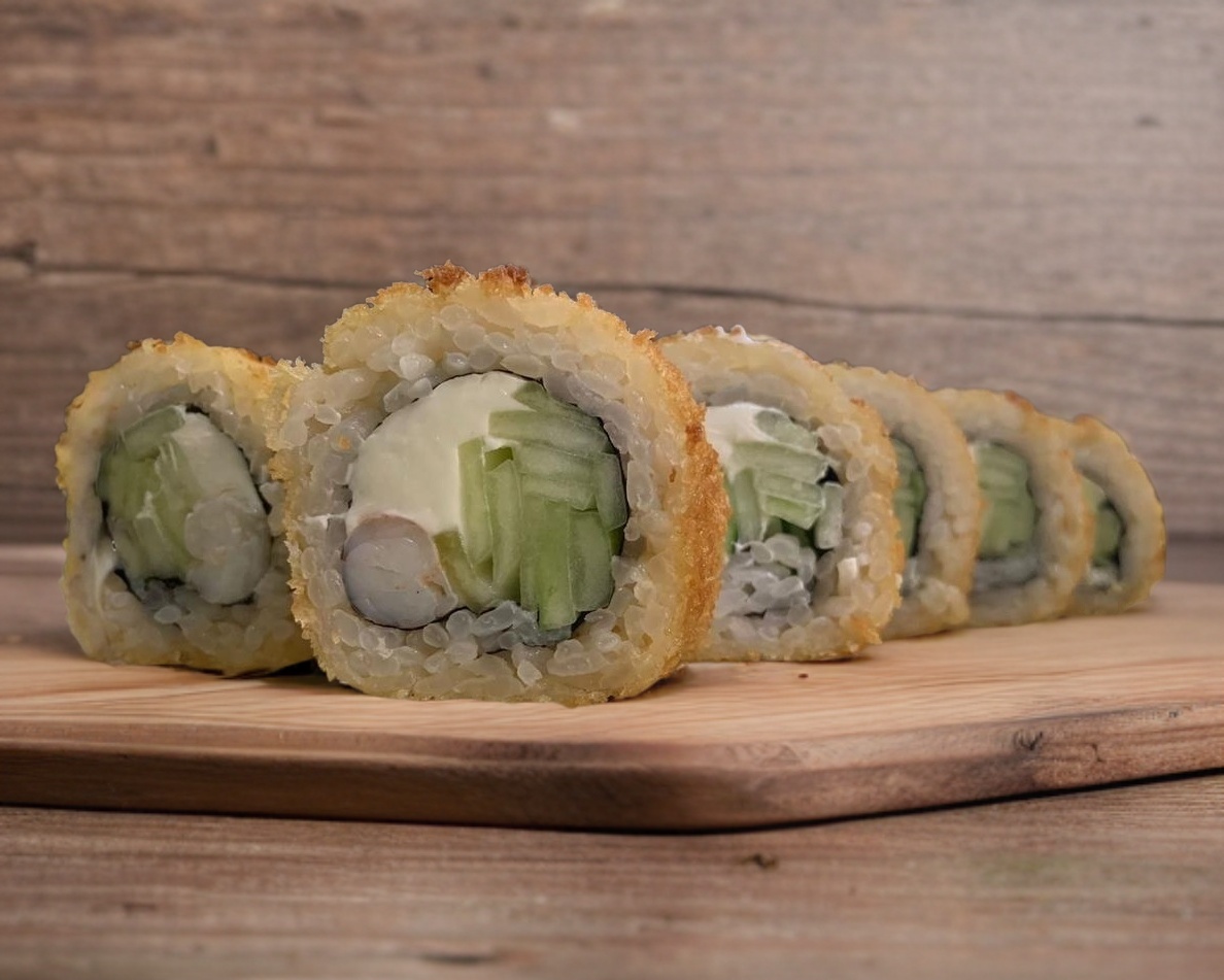 Envuelto en pepino, relleno de aguacate y Philadelphia y arriba aderezo y camarones empanizados.