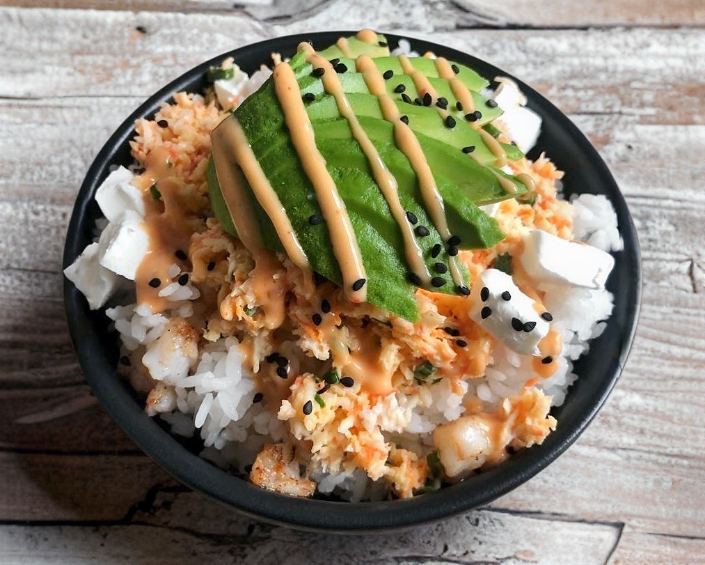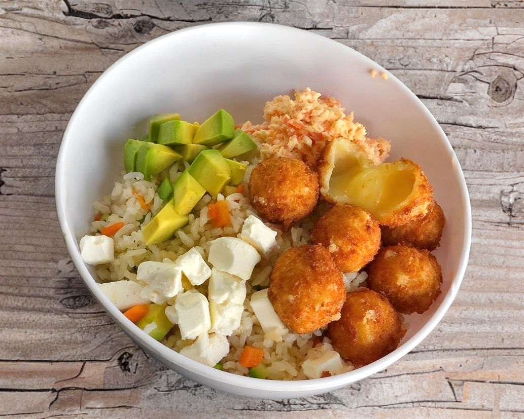 Arroz al vapor con aguacate, philadelphia y camarón empanizado