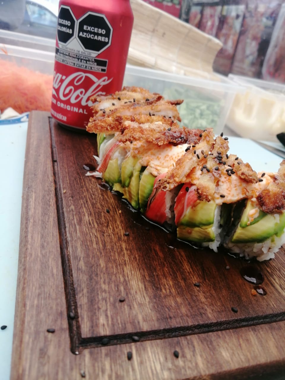 Envuelto en cangrejo y aguacate, arriba aderezo de masago y camarones empanizados salsa de anguila y ajonjoli