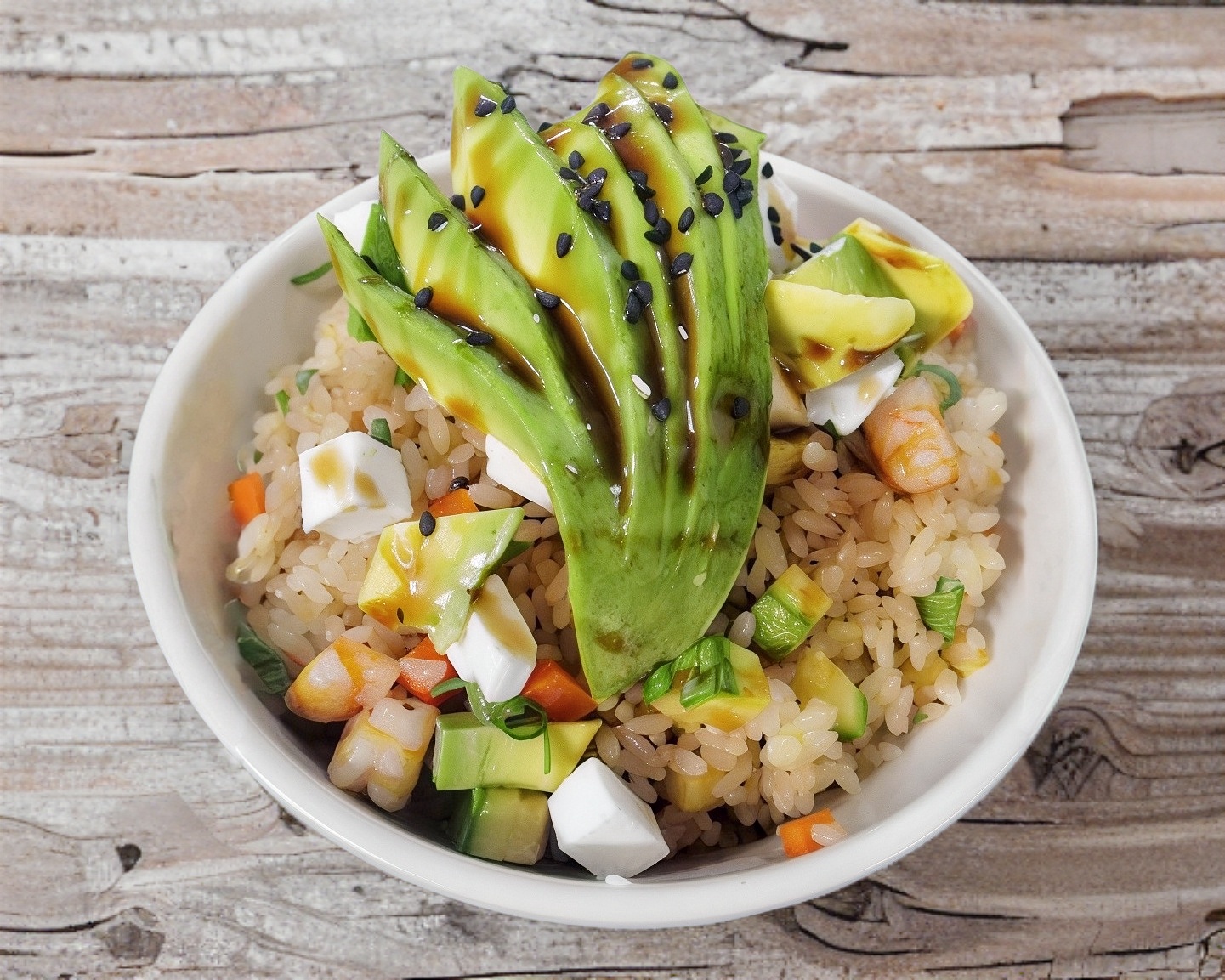 Arroz frito con aguacate, philadelphia, ajonjolí y proteína a elejir.