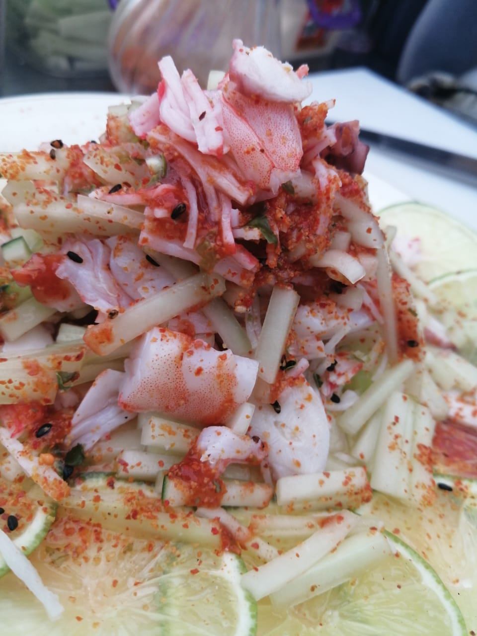 Pepino, Camarón Kanikama y Pulpo " con limón y chile"